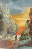 This particular postcard shows a woman walking down a tree-lined pathway past a quaint cottage at sunset....