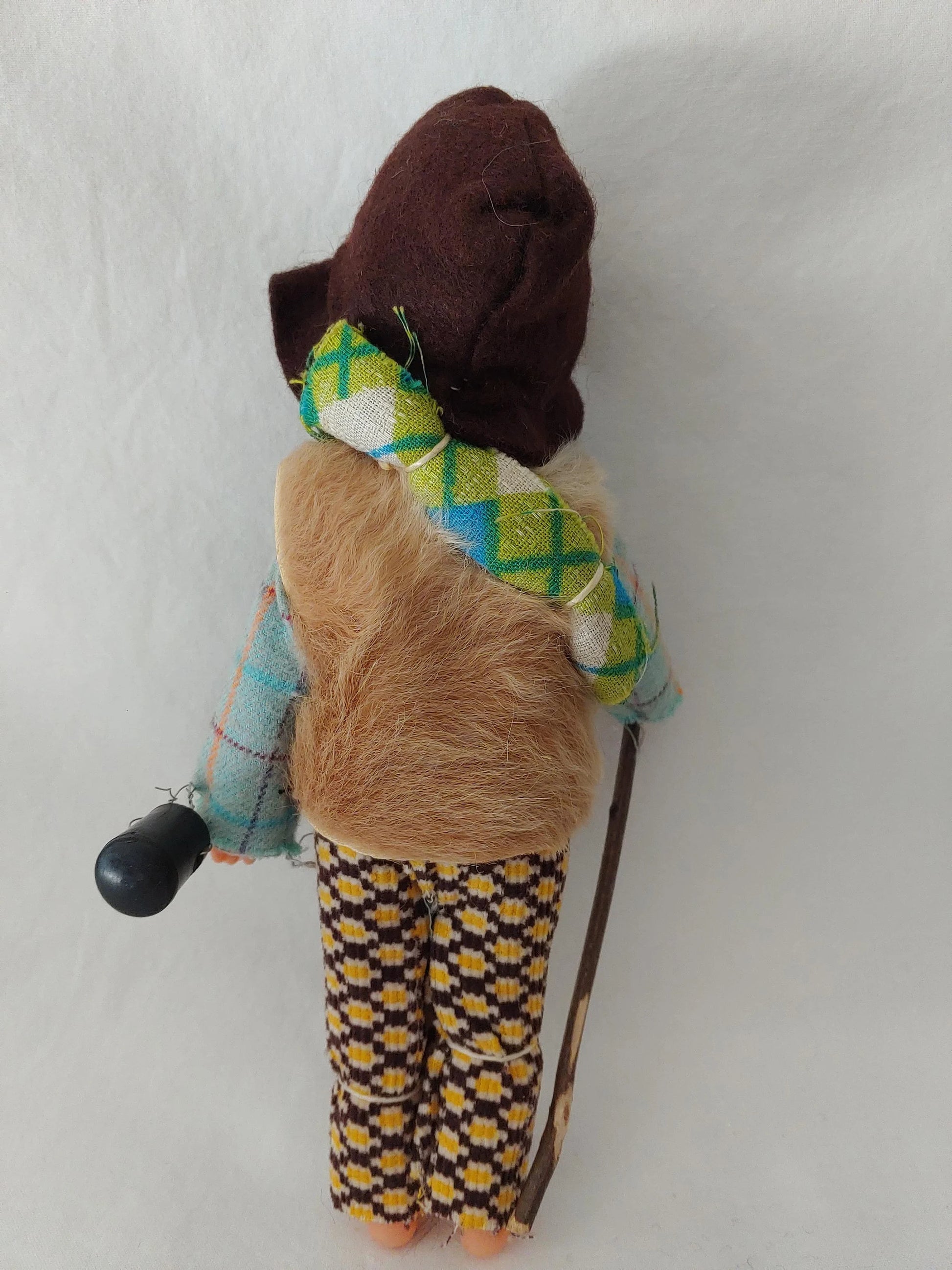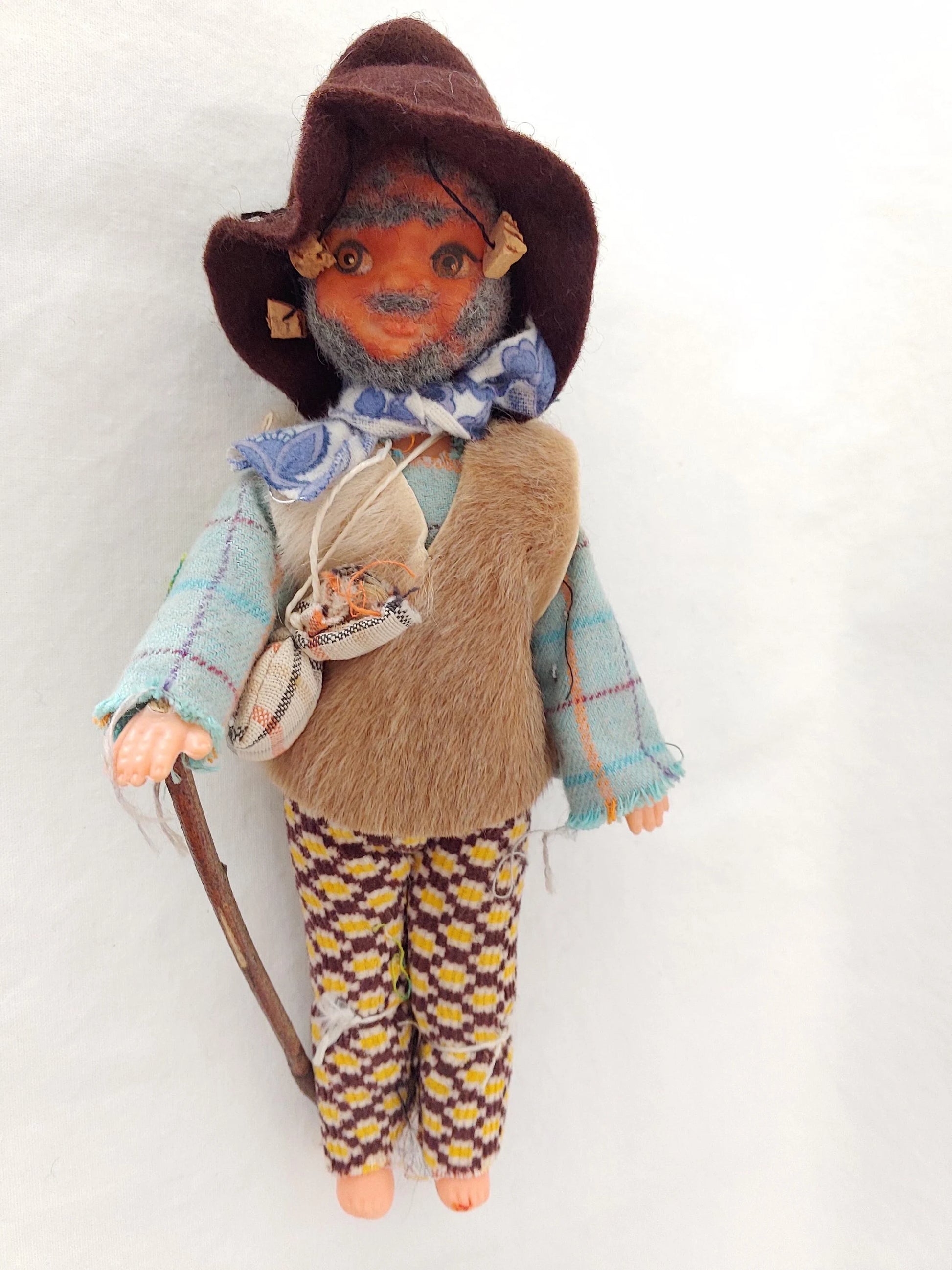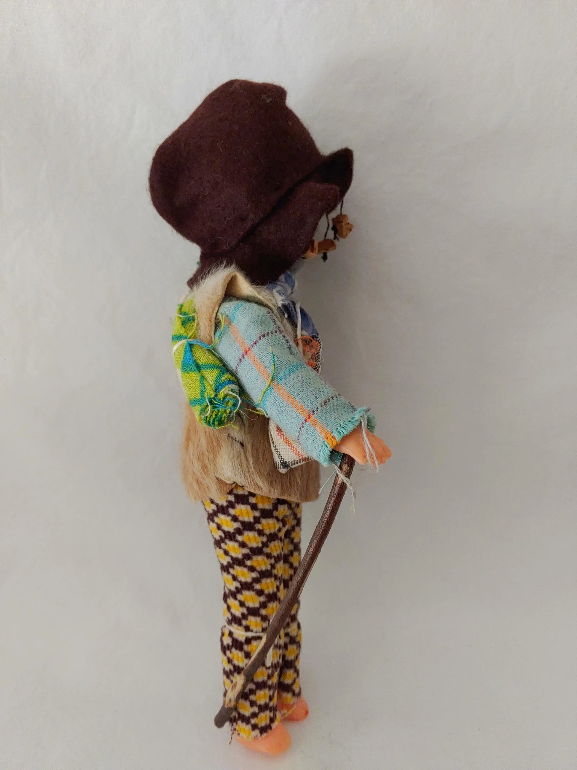 This vintage Swagman hobo doll has a walking stick, rolled up blanket, sack and a cup. He is barefoot with mix matched clothing and a fur vest. A rare find and wonderful addition to your collection.