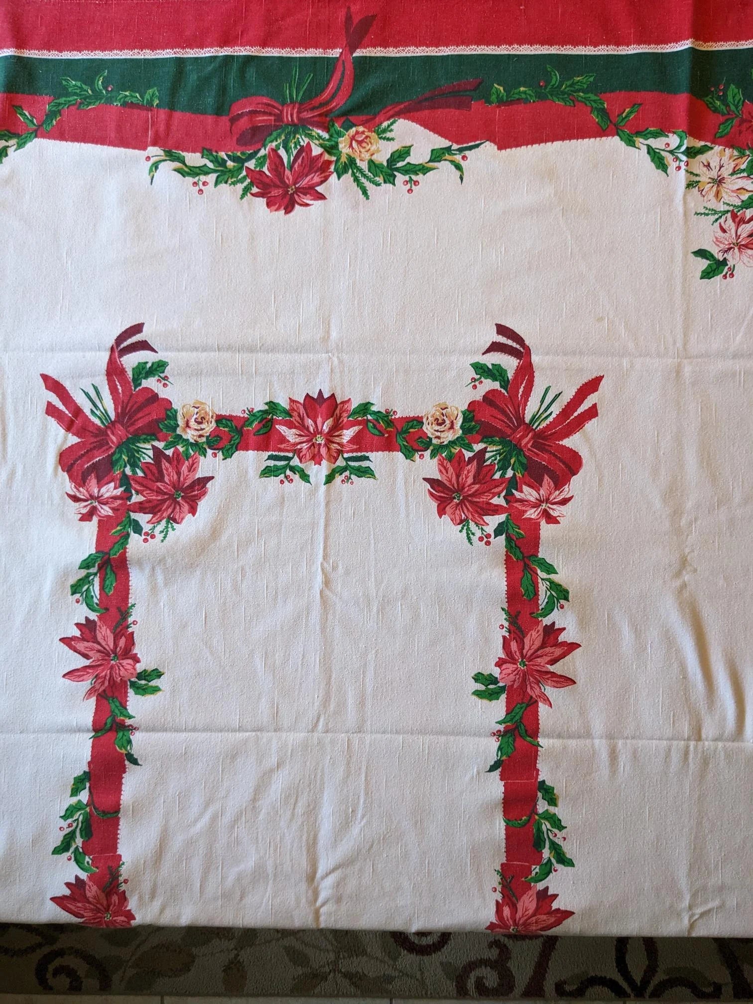Perfect for your holiday table. Featuring holly and poinsettias in green, white and red with flower and bow accents, very pretty. The fabric screams 1970's and you could use it for a Christmas tablecloth, or you can use the fabric for another project. It is in great condition with small spot (please see last picture) that is hardly noticeable.