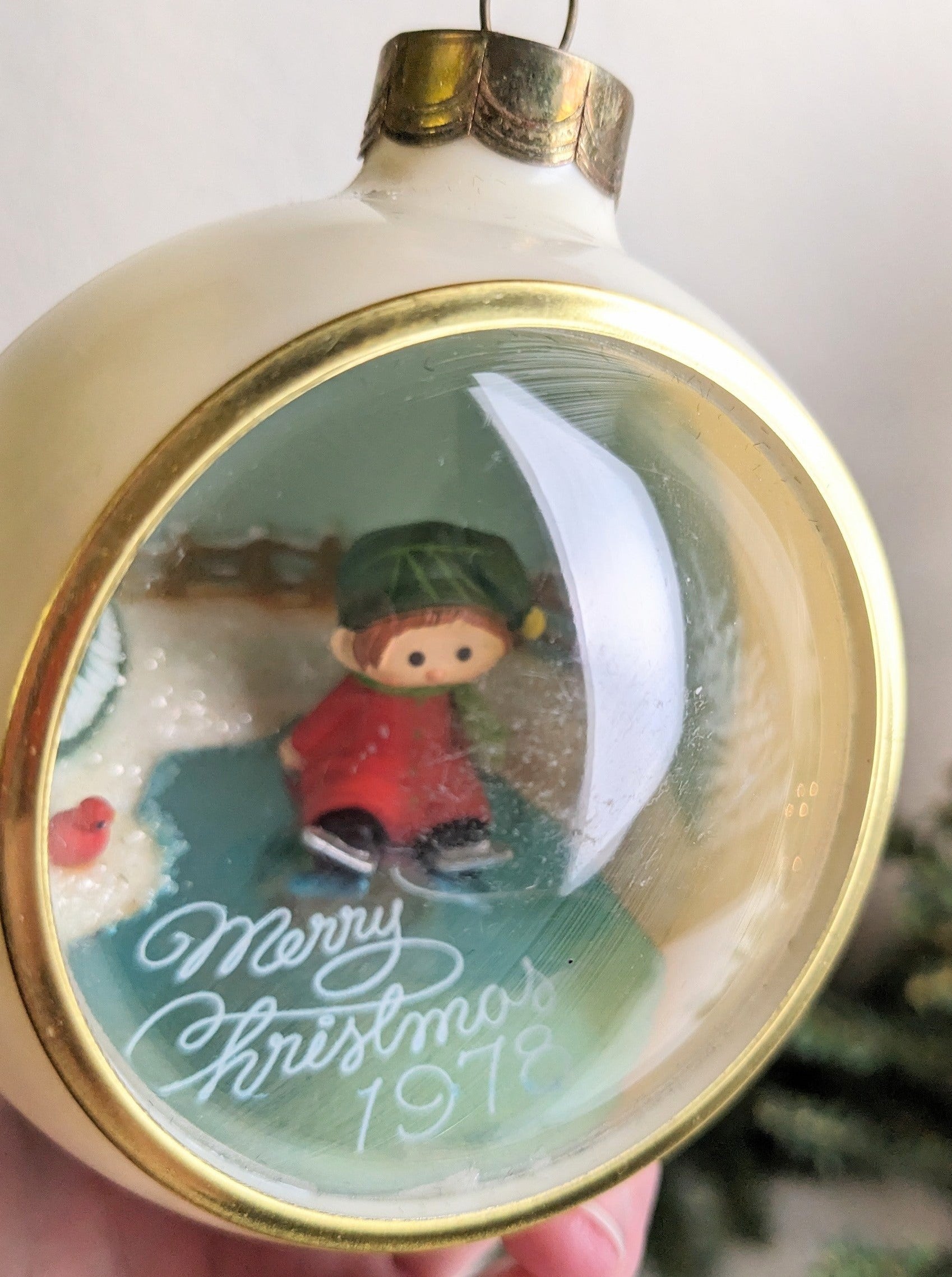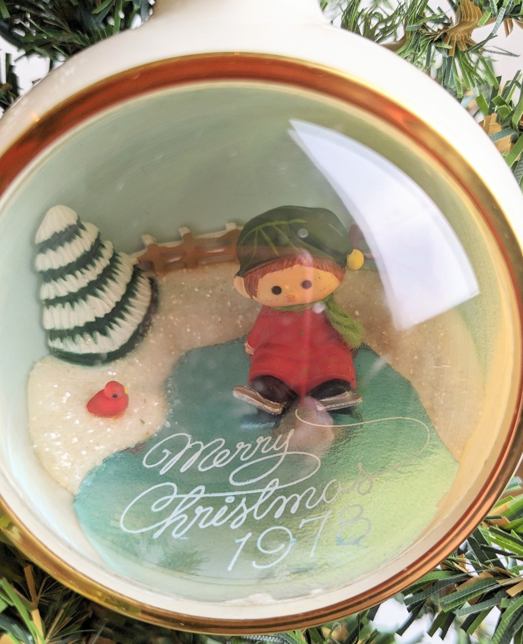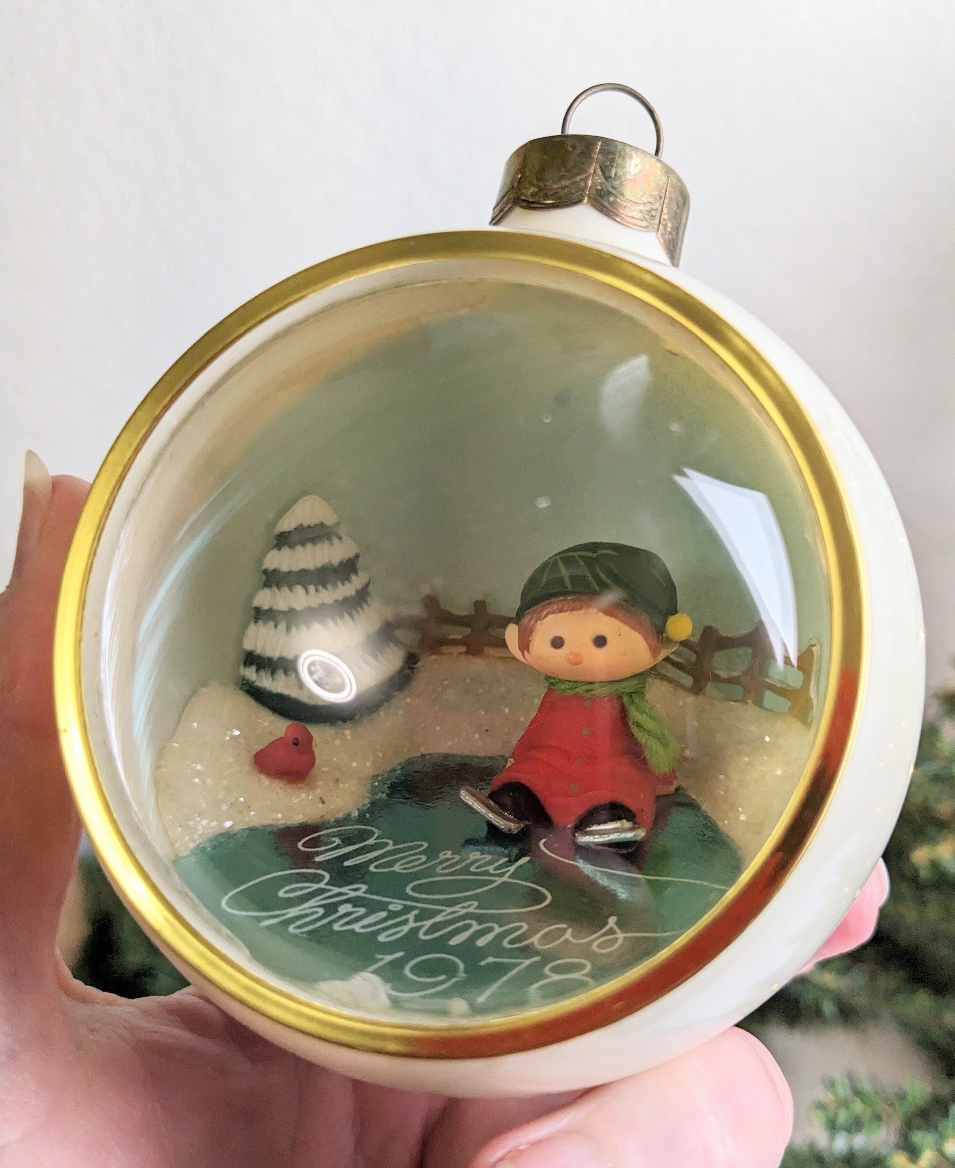 Beautiful Vintage Hallmark 1978 Ice Skating Boy Diorama Ball Christmas Ornament. This is a great find. This great diorama ornament features a little boy sitting on a frozen pond wearing ice skates with a Christmas tree and a cardinal. So cute!