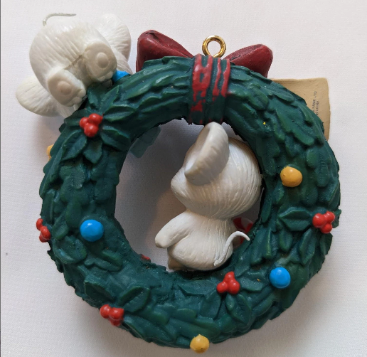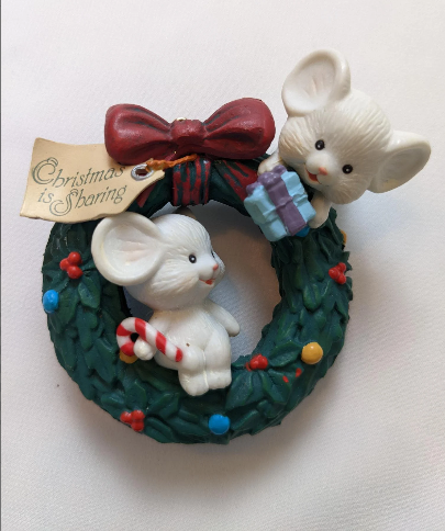 Vintage 1992 Lustre Fame Christmas Is Sharing Christmas Ornament. This is a rare find. This ornament features two darling mice exchanging gifts while in a Christmas wreath. So cute!