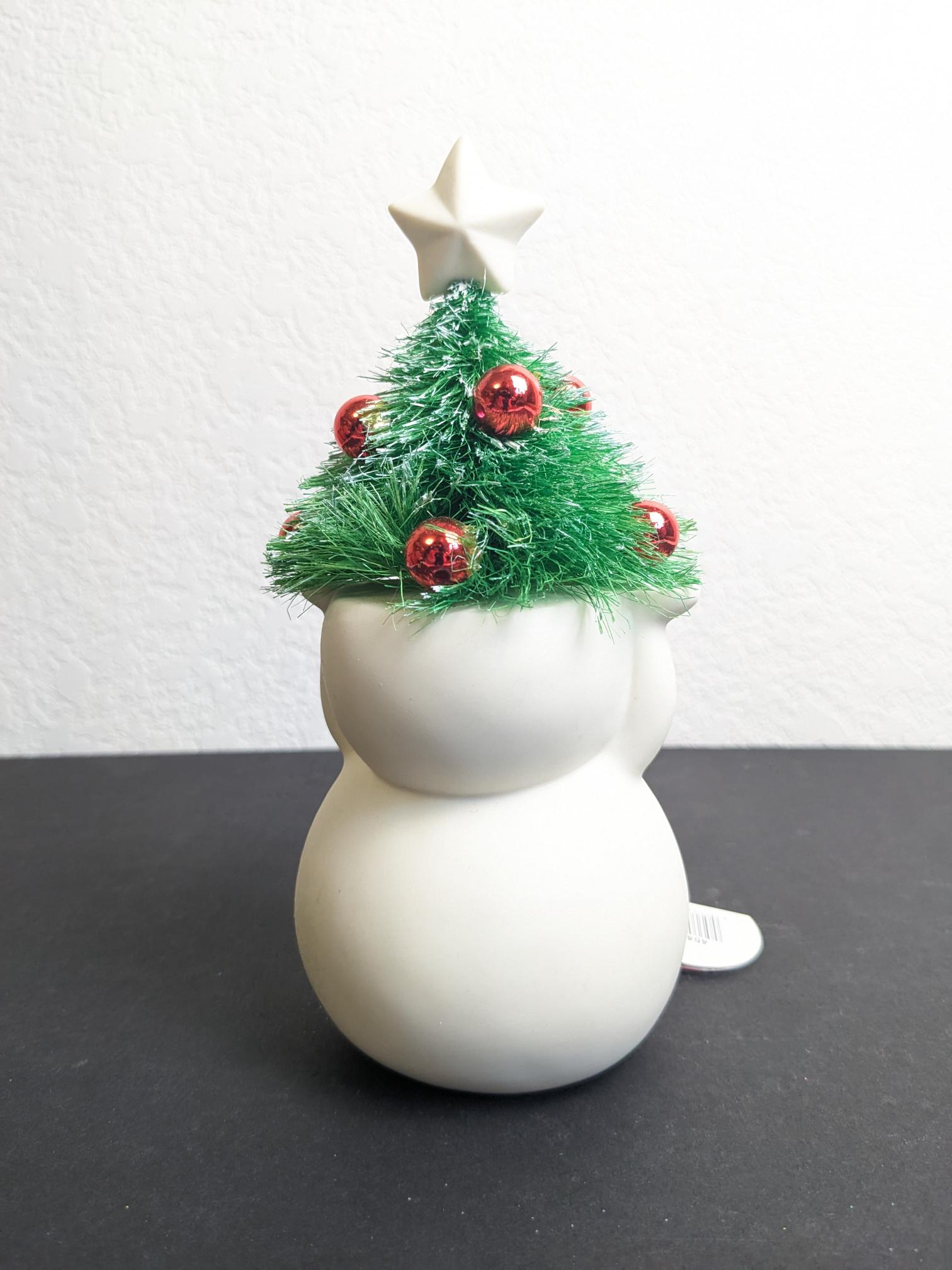 How fun is this? Gorgeous snowman with a beautifully decorated tree coming out of his head, just darling. He has a knitted red bow with a tag that reads "All Spruced Up". So cute!
