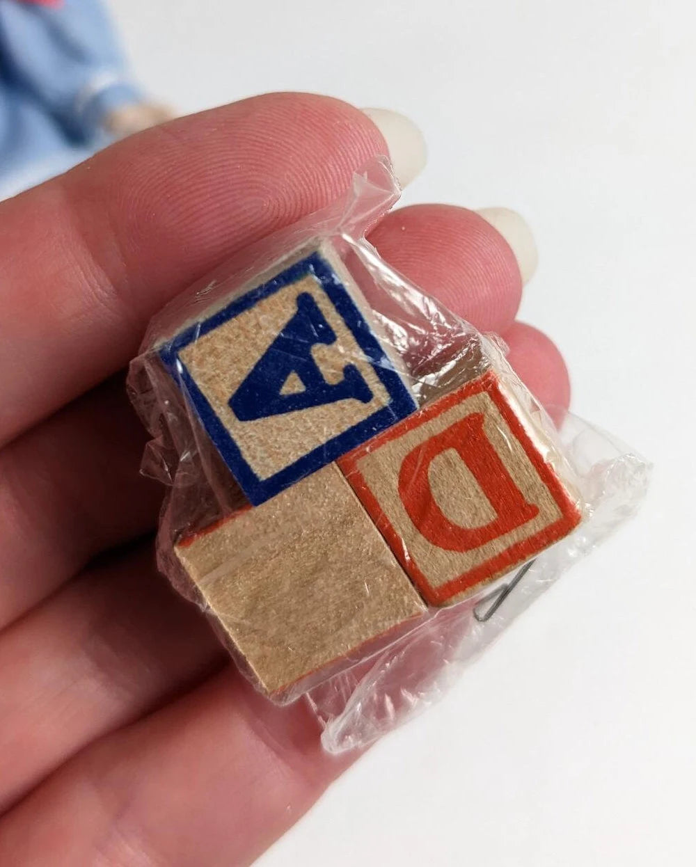 Vintage Yolanda Bello Porcelain Amanda doll featuring a girl dressed in a soft blue sailor's outfit with a red bow and 3 wooden blocks, very cute.