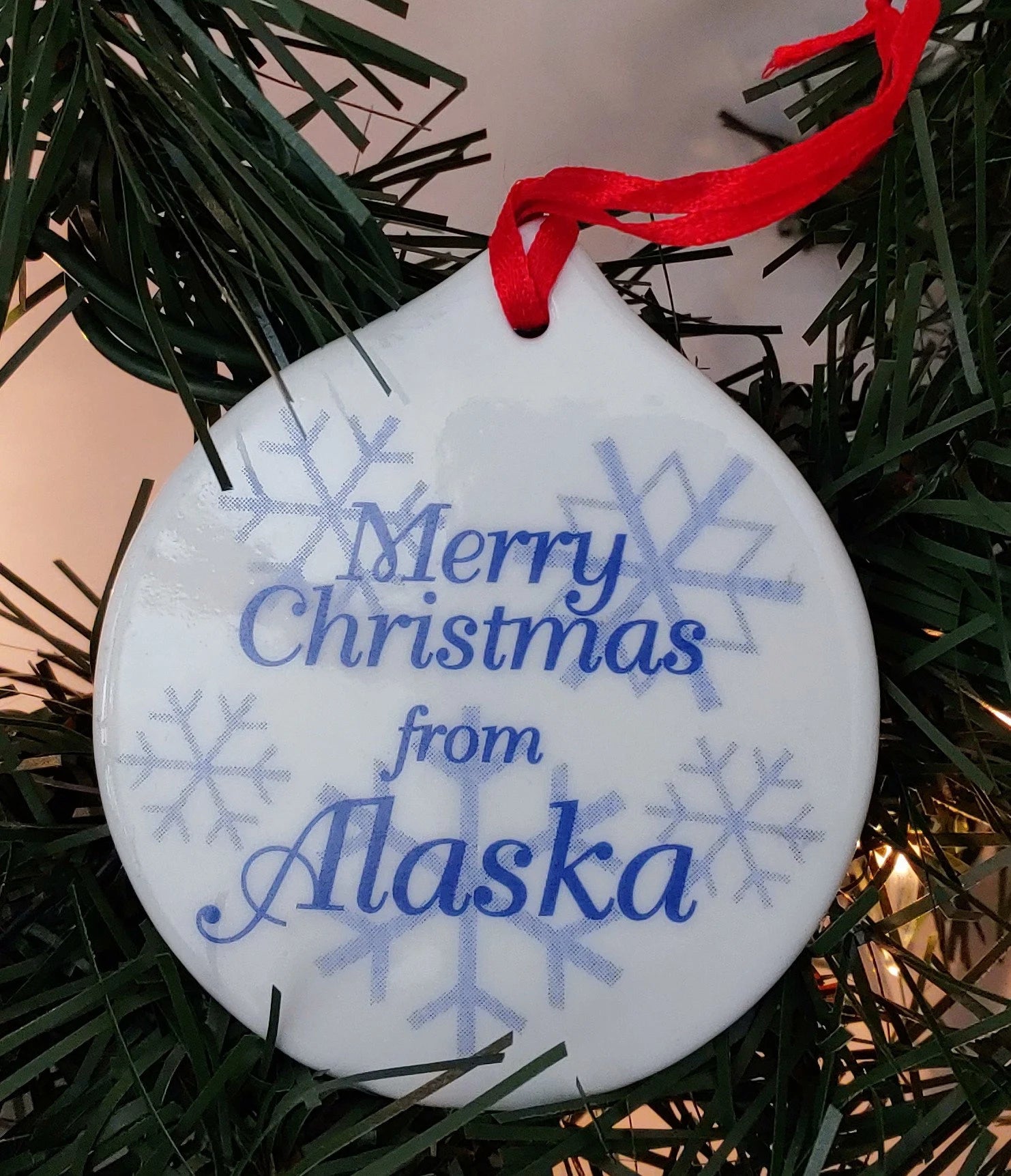 This is a rare find. You have a beautiful Angel flying over the mountains of Alaska on the front and Merry Christmas from Alaska on the back with snowflakes. Bold gorgeous colors with reflective gold accents and a red ribbon ready to hang.