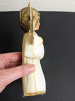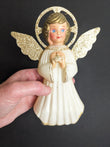 She is made of plastic and is in great vintage condition some discoloration and little white fuzz around the bottom, I believe she originally stood on a white cotton like cloud. This topper would look absolutely stunning on any Christmas Tree.