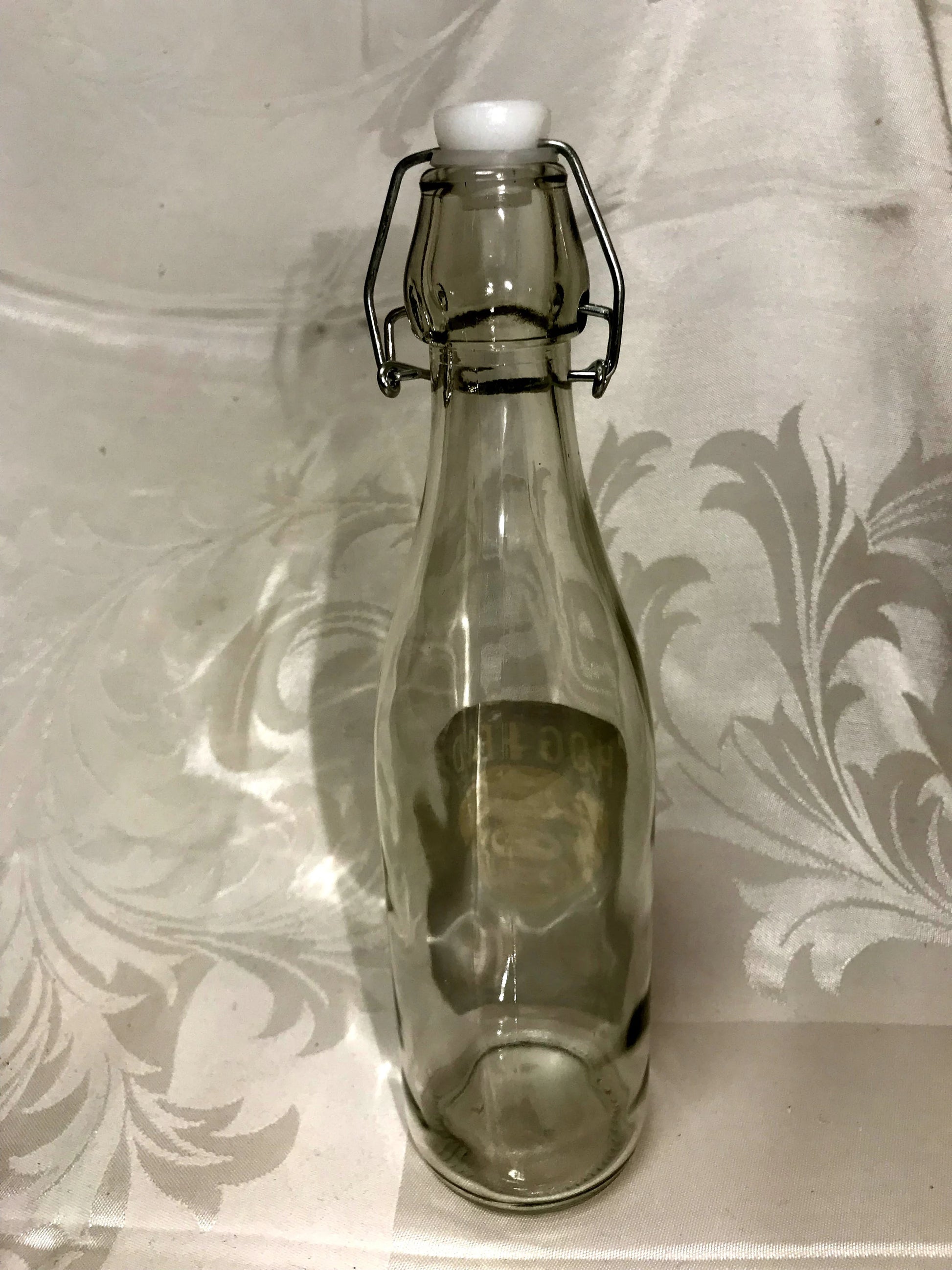 Vintage Style Glass Bottles With fancy vintage label glued to the front. It has a hinged stopper.