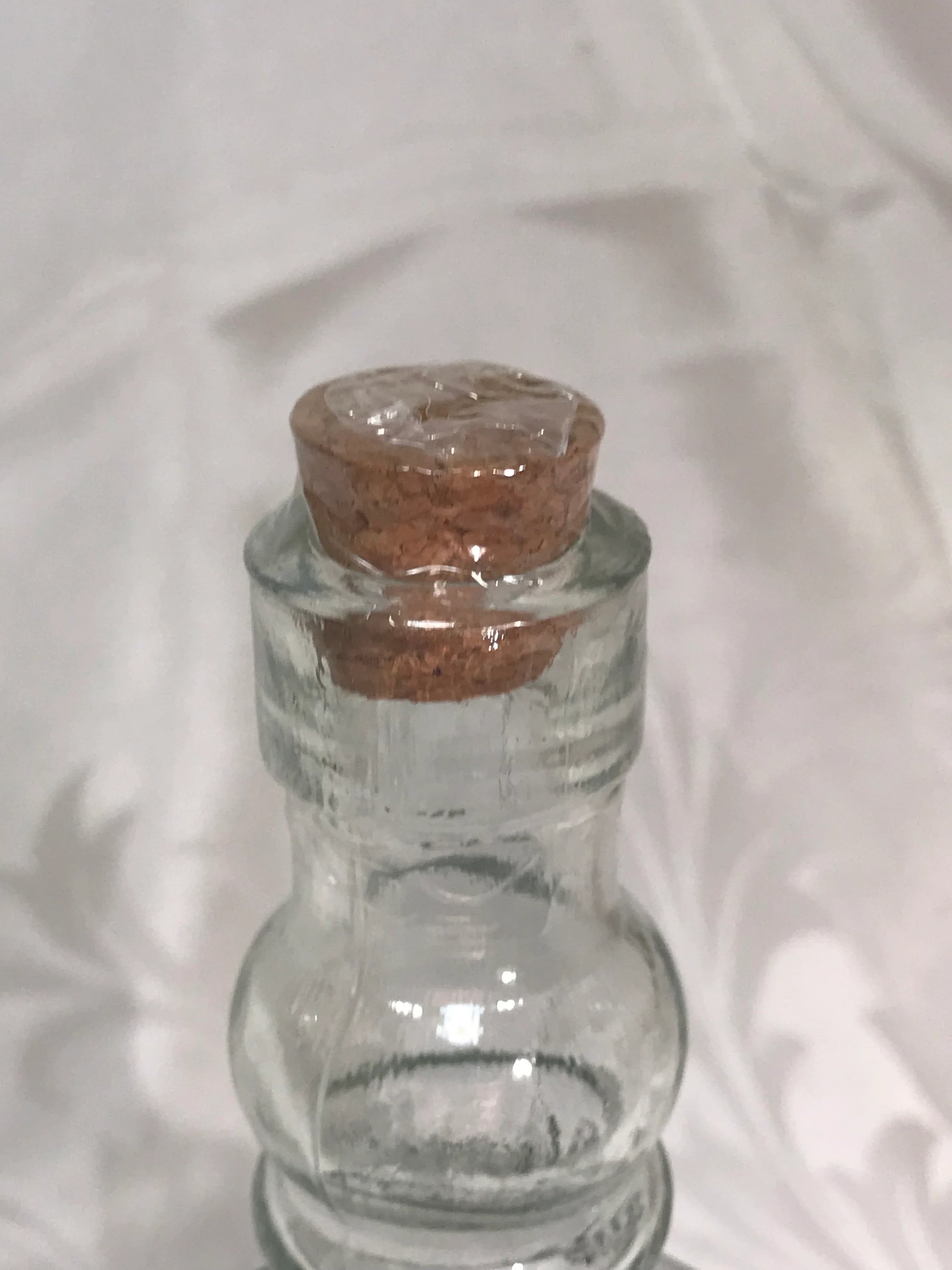 Vintage Style Glass bottle with vintage label glued To Front, and there is a new cork stopper.
