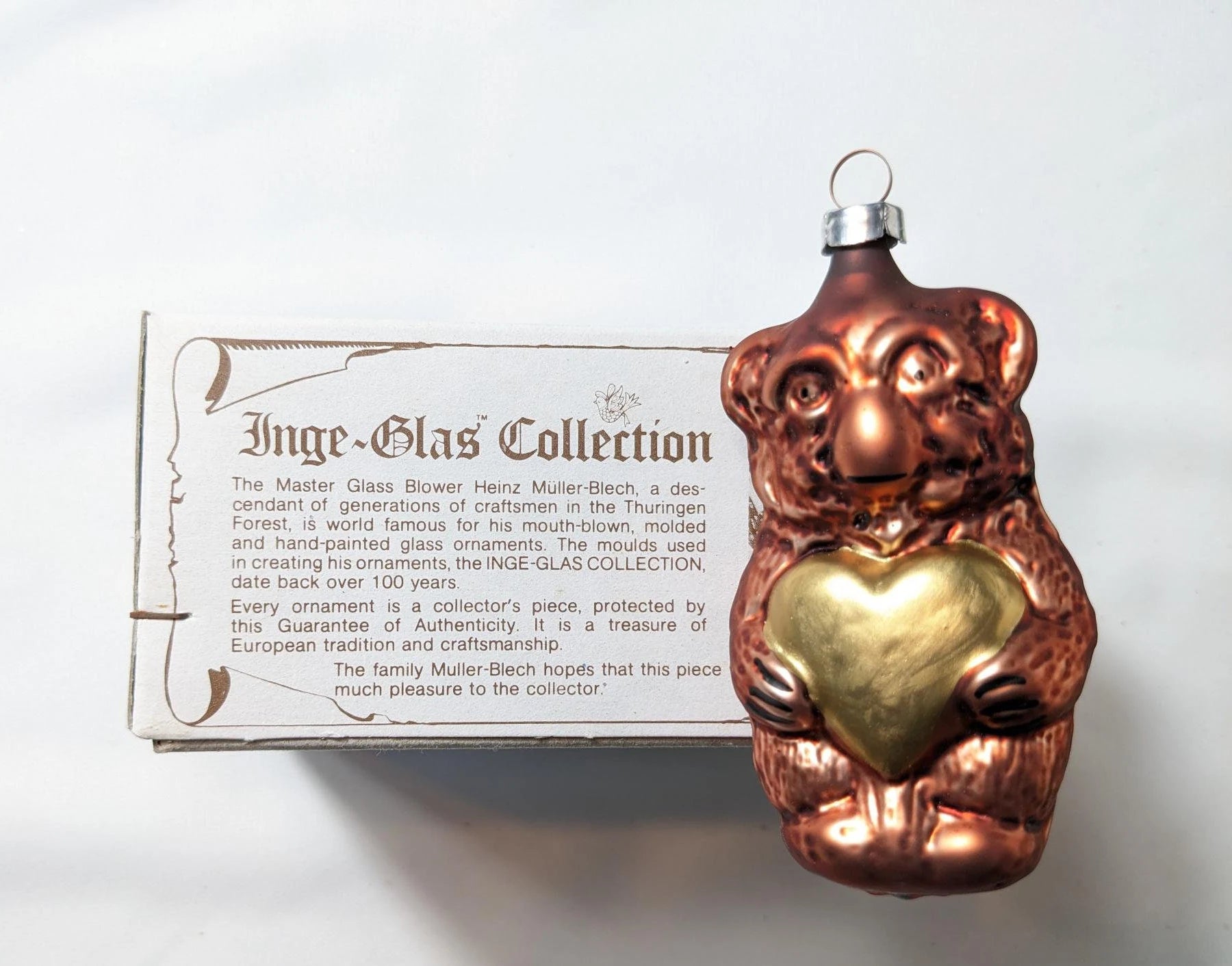 Each ornament is mouth blown and hand painted in the Inge-Glas workshop in Neustadt, Germany; a business owned and operated by the Muller-Blech family for 14 generations, since 1596. Dating back to the 1850's the Inge-Glas collection includes more than 6000 antique molds, many of which are re-introduced each year. Preserving the 410-year-old family tradition of glassblowing, every ornament is handcrafted in limited quantities. Each ornament from 1987 forward, carries the 5 - Point Star Crown of Inge-Glas, your guarantee that you possess a mouth blown, hand painted German Christmas ornament. Old World Christmas of Spokane Washington was the exclusive distributor for Inge Glas ornaments until 2000.