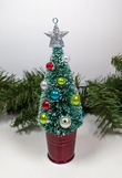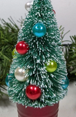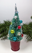 New Bottlebrush Christmas Tree Christmas Ornament. What a fun ornament. Bottlebrush tree in a shiny red bucket with color bead ornaments and snow tipped branches. So cute and very retro.