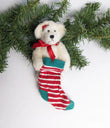 This is a great find! Vintage Boyds Bear Devon Christmas Ornament. This wonderful white bear is holding a red stripped stocking with holly by his ear and a matching red bow around his neck. He has posable arms and legs. Very cute.