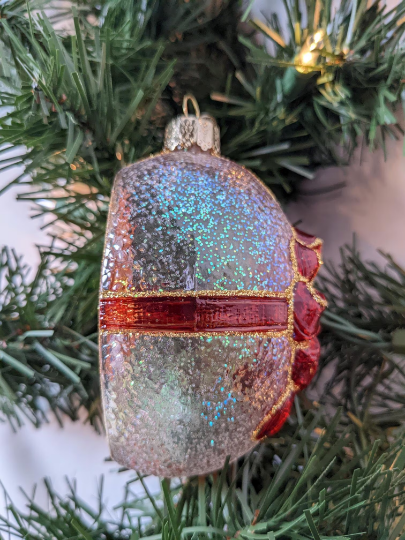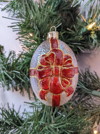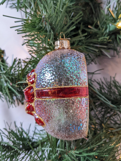 This egg shaped gorgeous French Bread Baker Glass Christmas Ornament is very rare and simply beautiful. Fantastic detail in this ornament! French Baker is holding a loaf of bread with pots and pans hanging behind him on a brick wall. So cute and perfect for the baker in your life. The sides and back of the ornament has a stunning iridescent sparkle accent with a beautiful red bow. Made Of Glass. Indoor Use Only. This ornament is called "inside out art" where they paint it inside the ornament. I'm not sure how in the world they do this, but the design is on the inside of the ornament, not the outside.