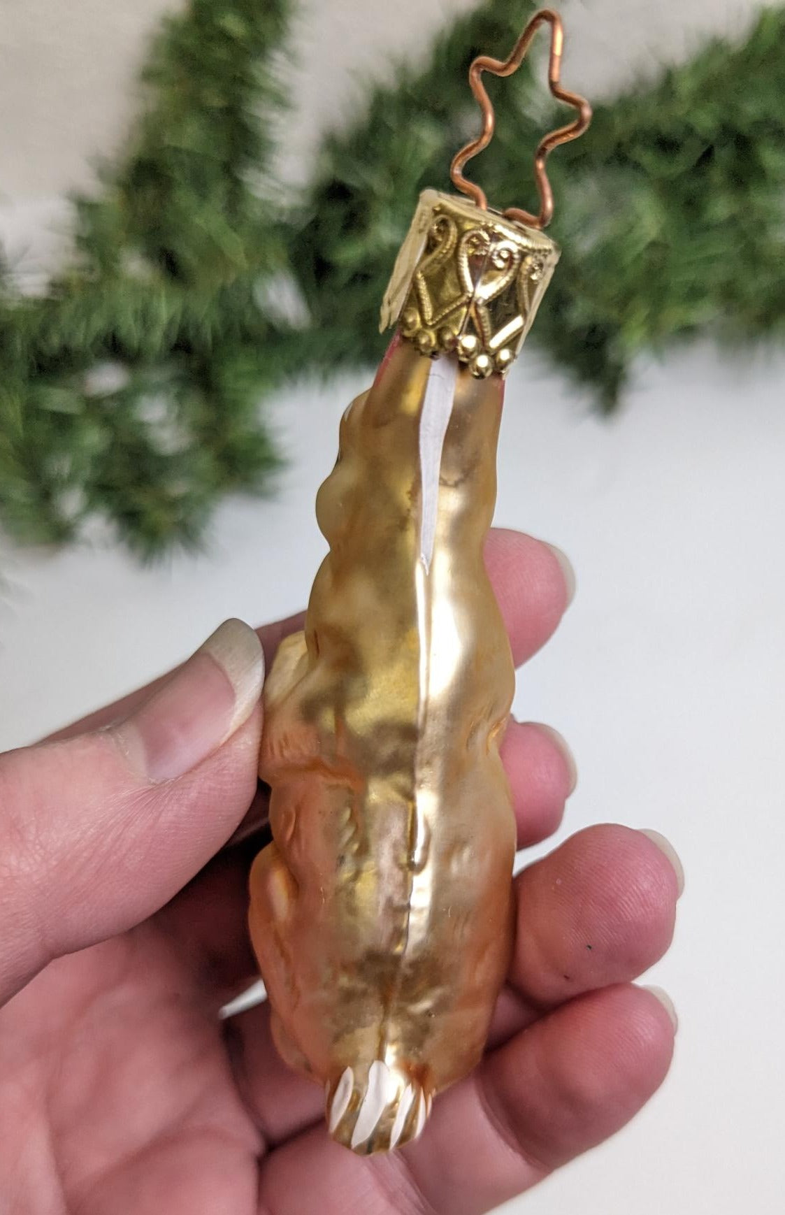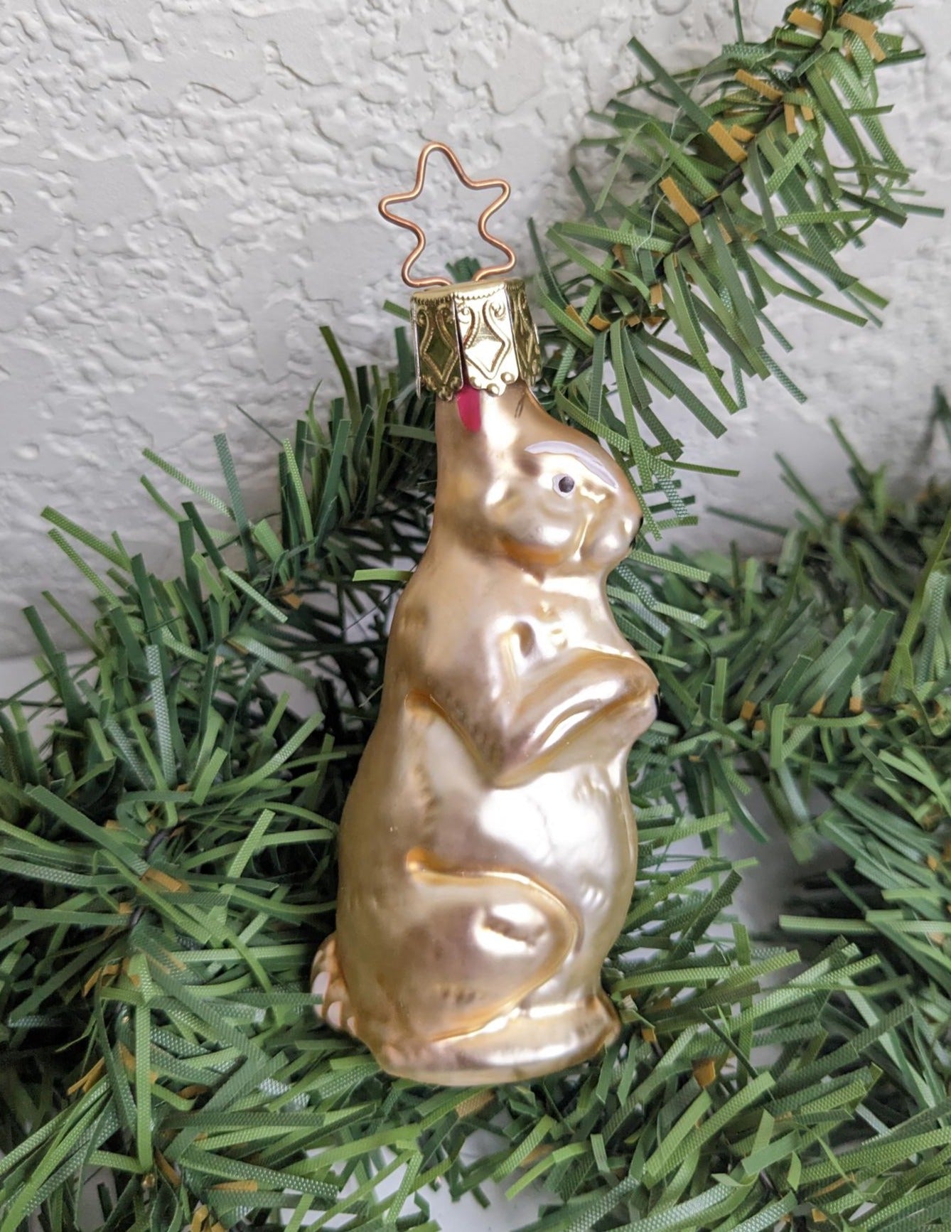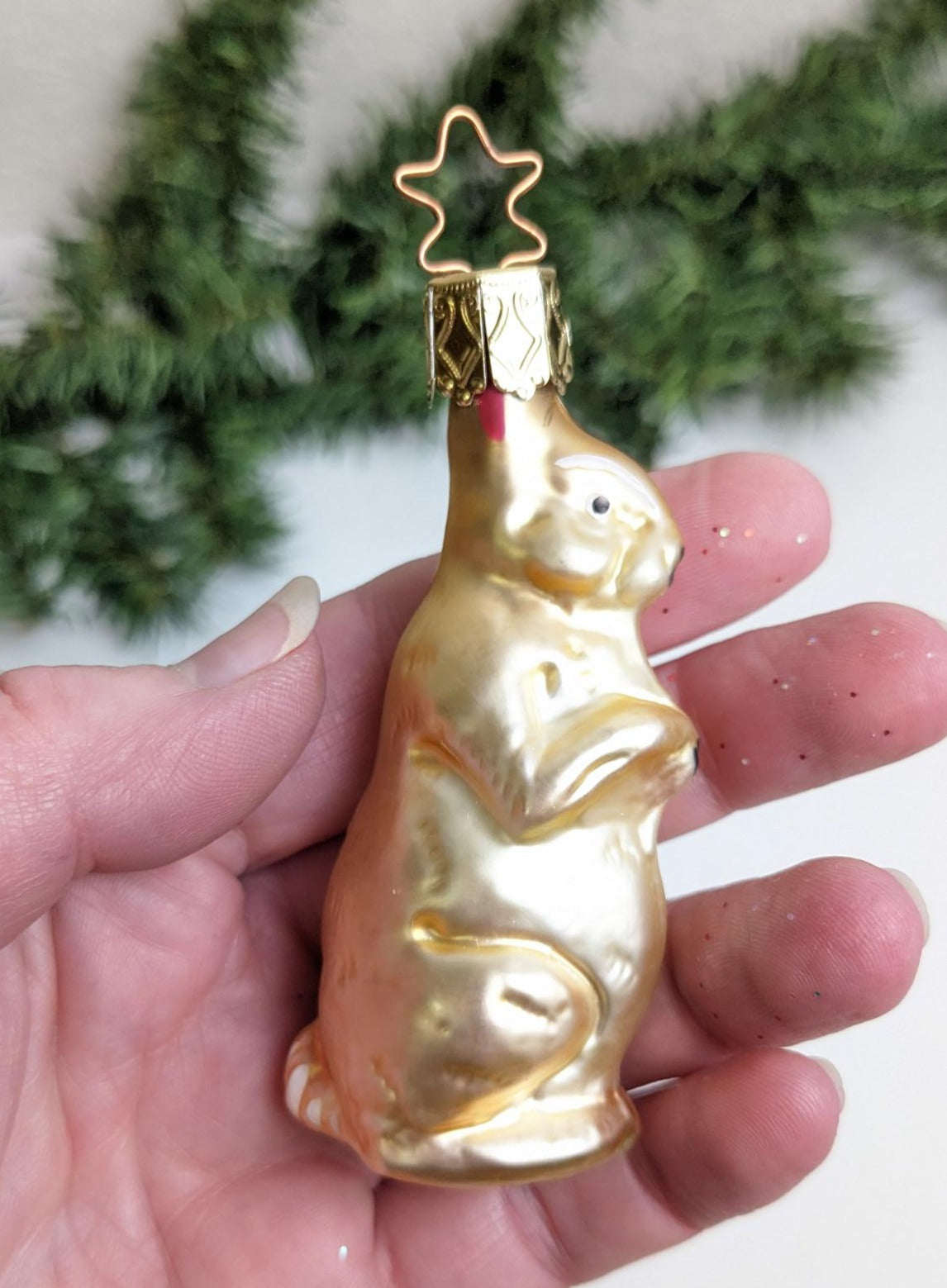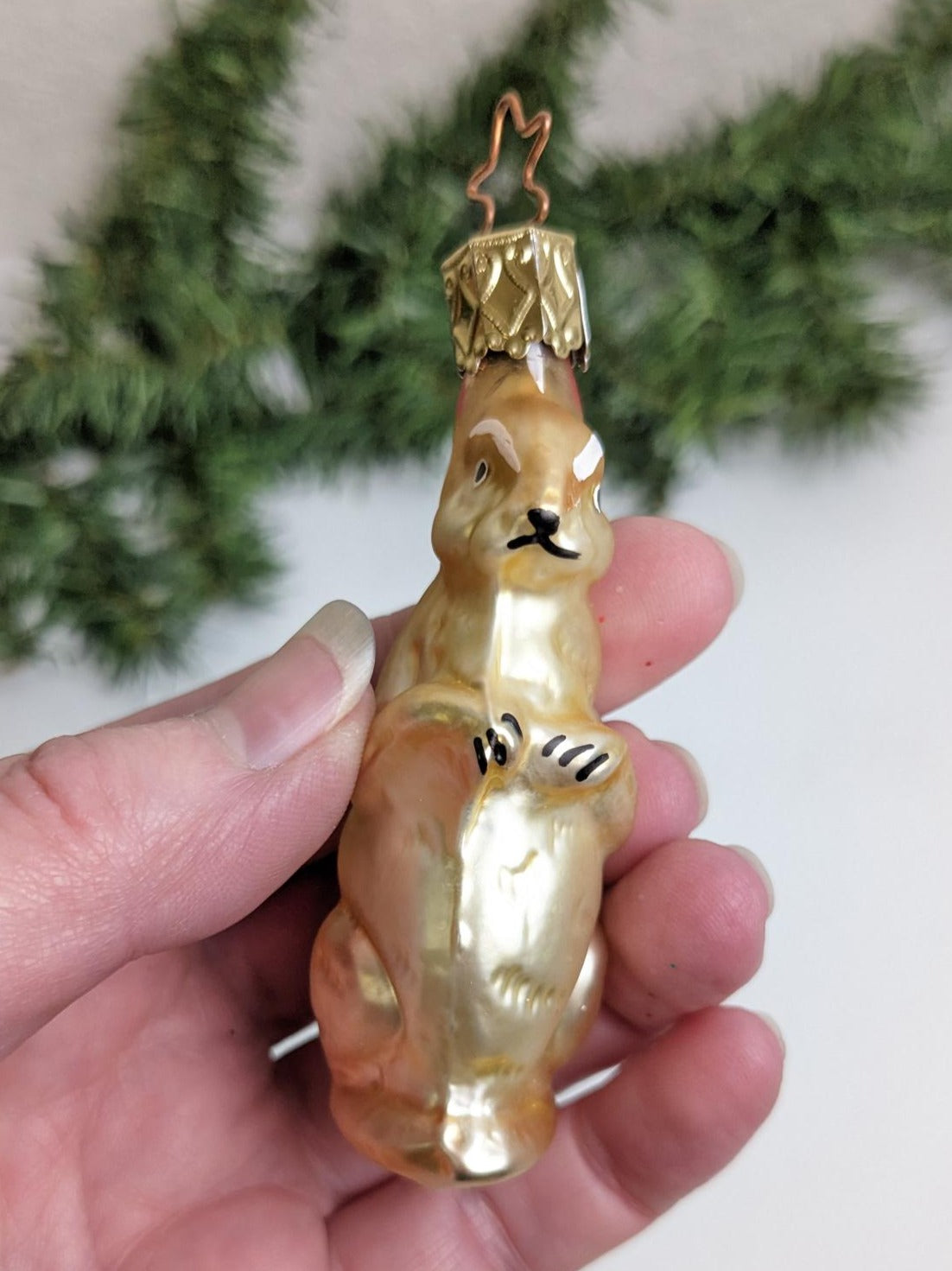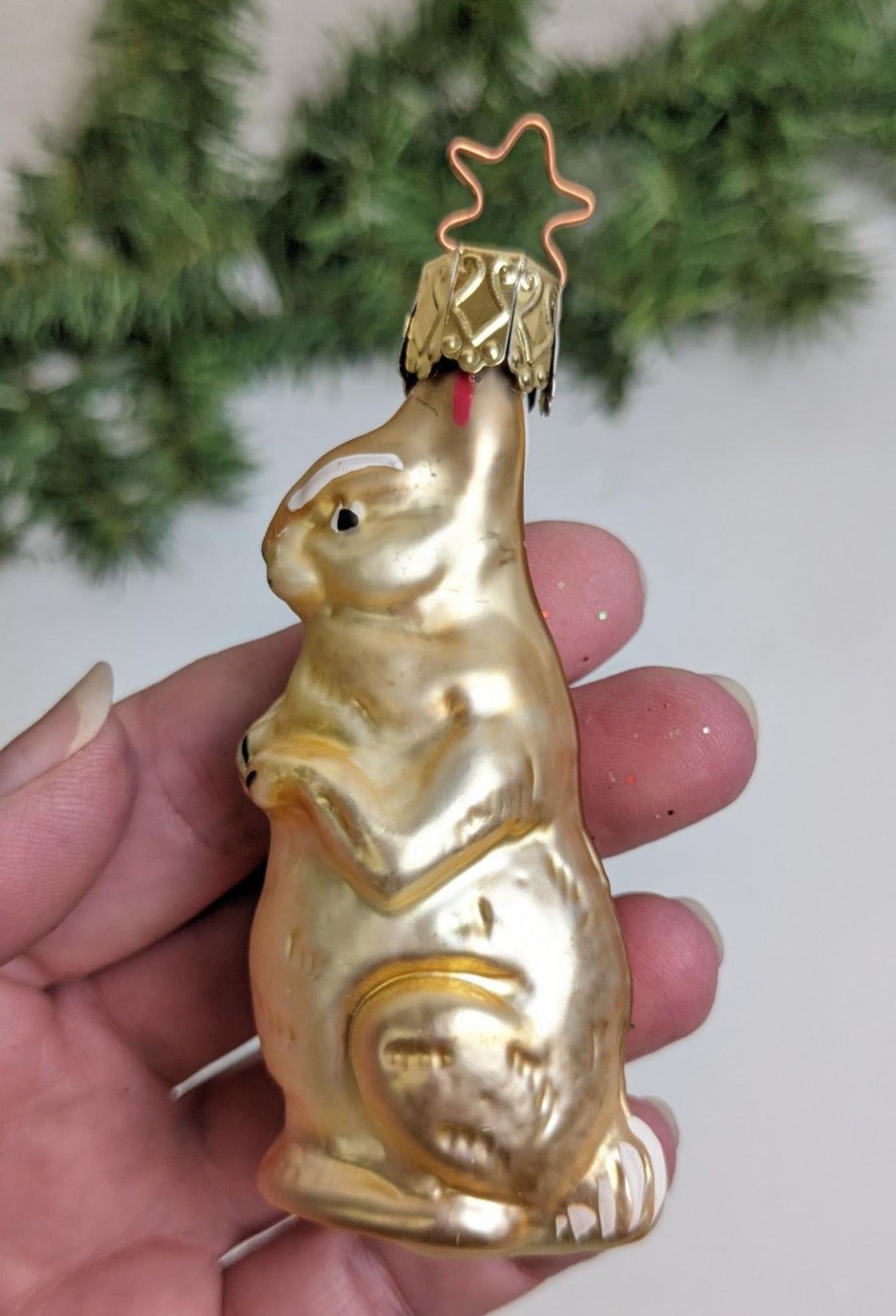 Gorgeous Bunny Rabbit Glass Christmas Ornament made by Inge-Glas in West Germany, part of the Bride's Tree Collection. What a rare find and absolutely beautiful with wonderful detail and color. Makes a great heirloom or hostess gift. Wonderful addition to your vintage Christmas ornament collection. This is a RETIRED old World Christmas ornament, and they are very hard to find anymore. Measuring 3" tall.