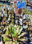 Chick Charms® Giant Gold Mine™ is a rosette of berry stained gold. The large size and dramatic colors of this plant will draw the eye wherever you want it in your garden. This plant is similar to Sempervivum 'Gold Nugget' and very similar to Sempervivum 'Gold Rush', but this plant dwarfs the former two. This is one of the new GIANTS and it is said to grow 10 inches across. These are growing in a 6 inch pot.