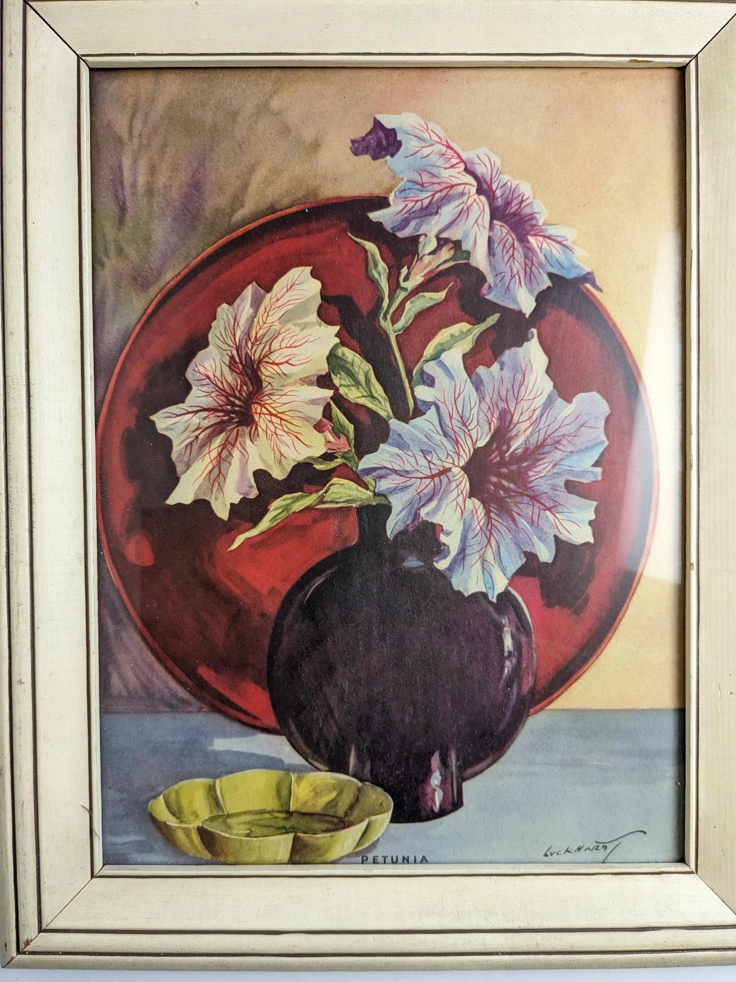 The print is signed "Lockhardt" and titled "Petunia". This vintage print comes in a cream wood frame that can be hung. Beautiful vintage image that takes me back. Would look fantastic anywhere and would make a great addition to your collection. Hurry we only have 1 in stock.