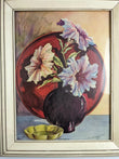 This is a great classic framed vintage picture. Featuring a black vase filled with beautiful colorful petunias with a red platter in the background, so pretty. The attention to detail with regards to the veining in the petunias is amazing. I love the green tray Infront of the vase, very 70's. This is just gorgeous.