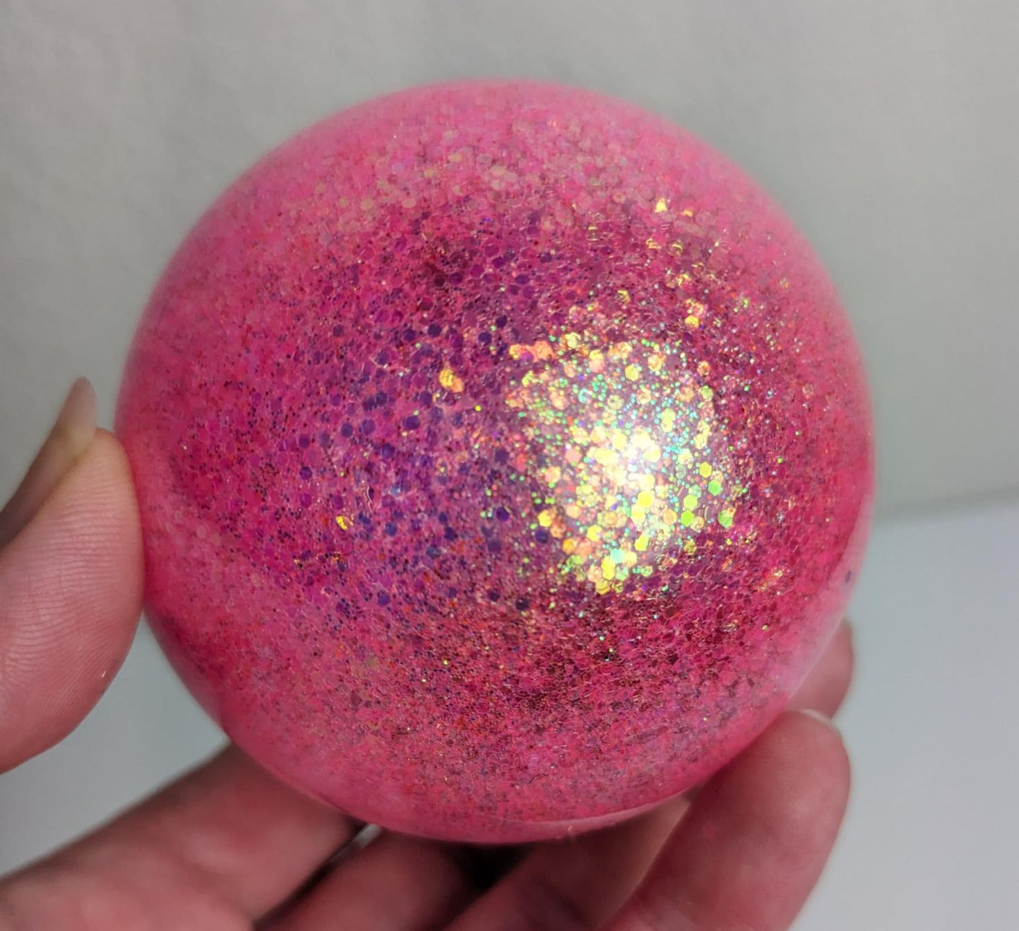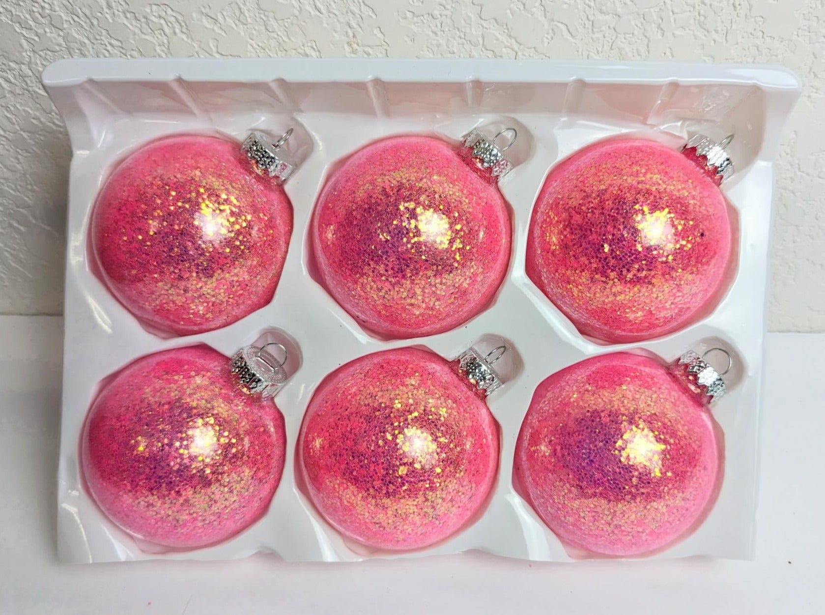 Vintage Set of 6 Bubble Gum Pink Glass Ball Christmas Ornaments. These are absolutely gorgeous. Great gift for the pink lover in your life. Covered inside with a gorgeous pink glitter they are made to sparkle.