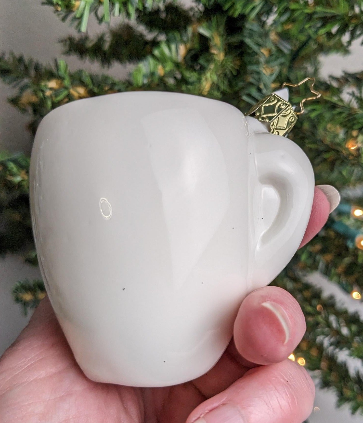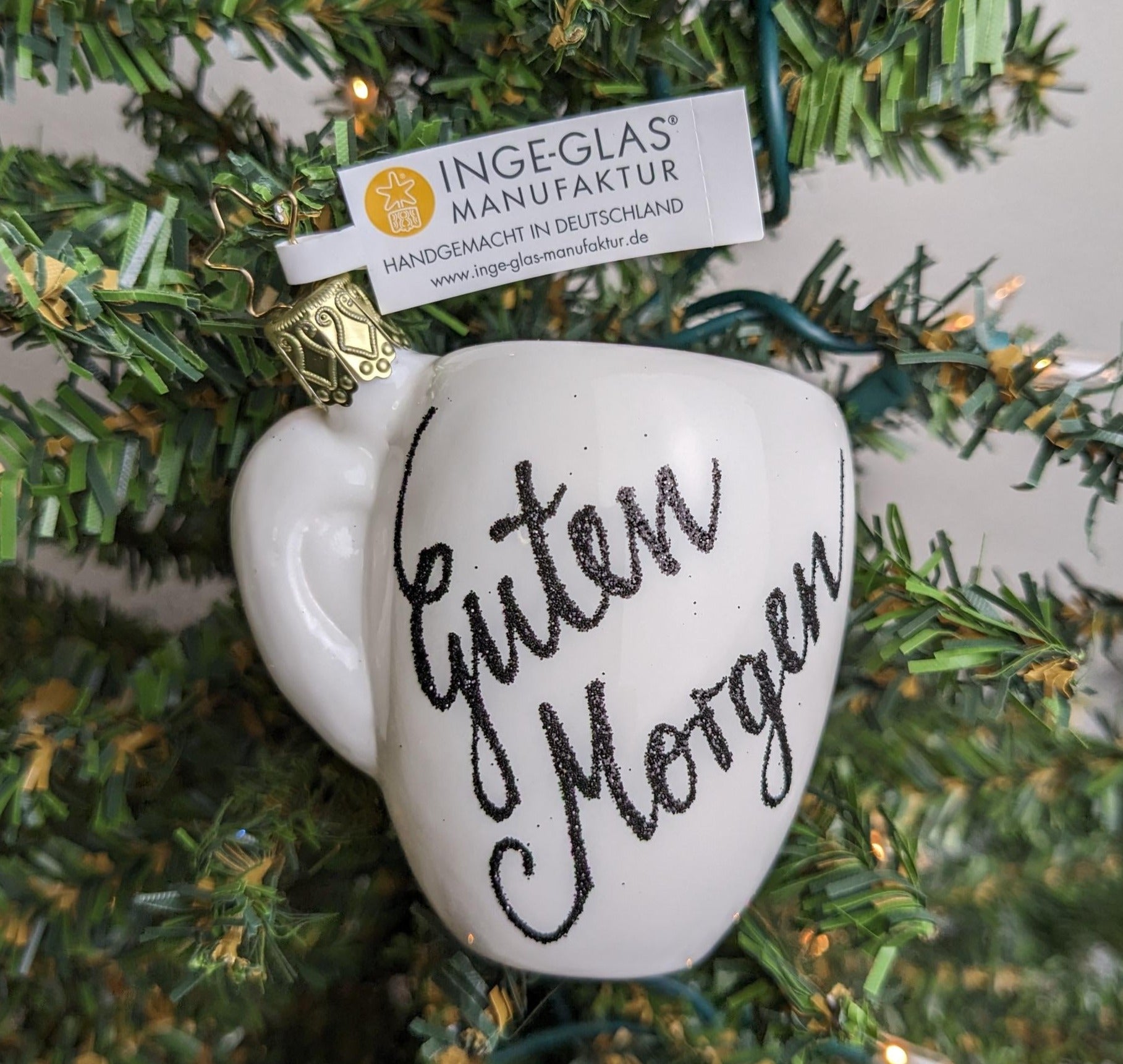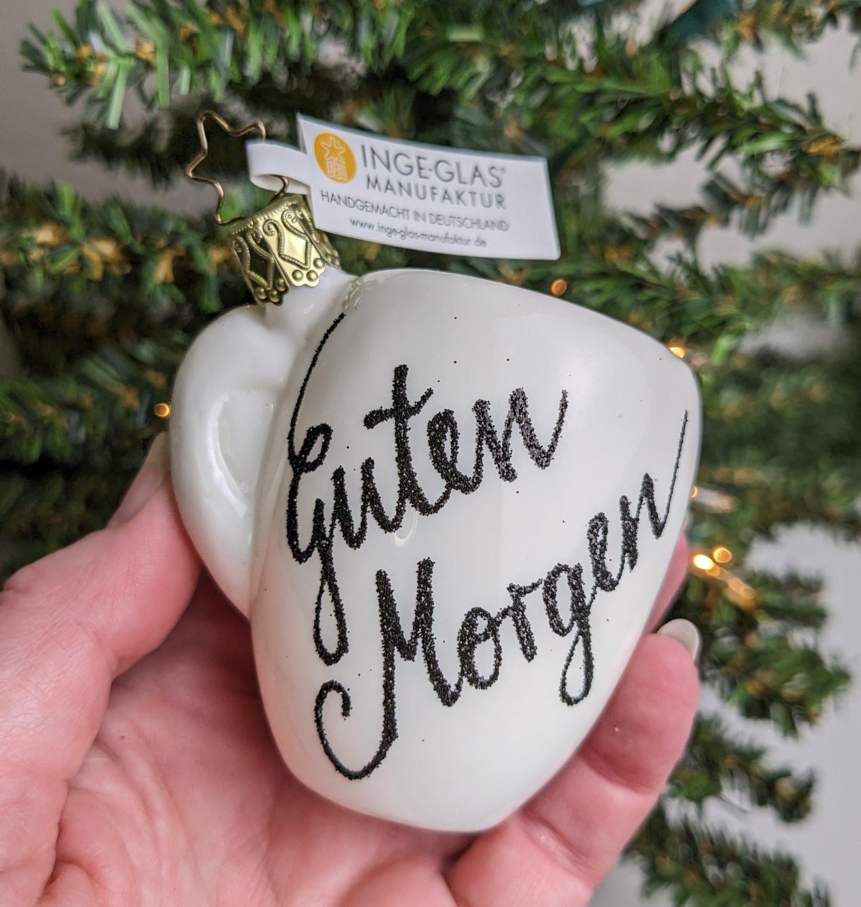 Gorgeous Scent of Coffee Guten Morgen / Good Morning Christmas Ornament made by Inge-Glas in Germany. What a rare find and absolutely beautiful with wonderful color and detail. Perfect gift for the coffee lover in your life. Great addition to your Christmas ornament collection.