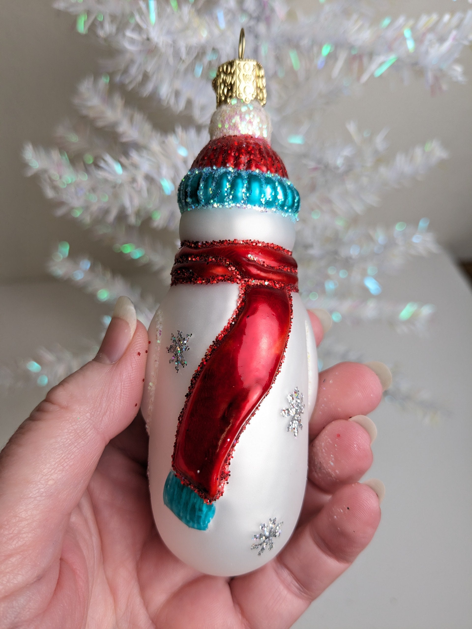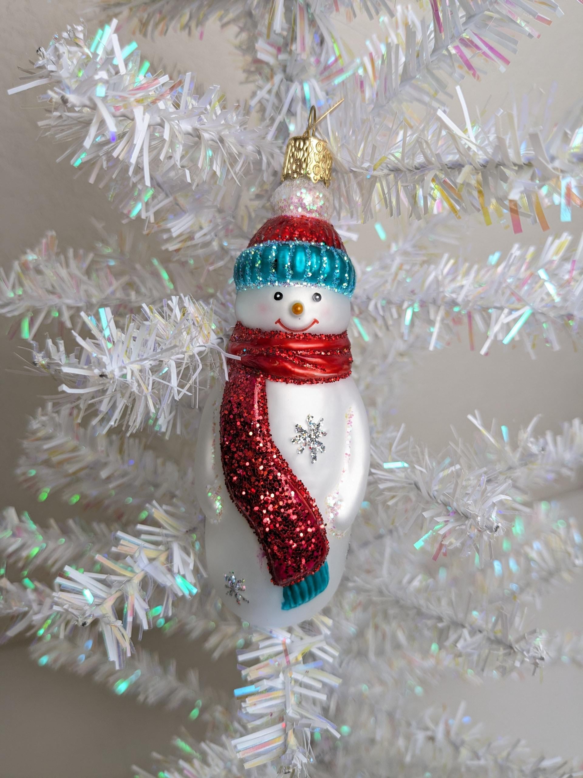 NEW Old World Christmas Snowman with Red Scarf Christmas Ornament. Long ago, when toys were scarce and neighbors could be miles away, children looked forward to snowfalls with great anticipation. This wonderful gift from heaven afforded them the opportunity to create a new companion their very own snowman!