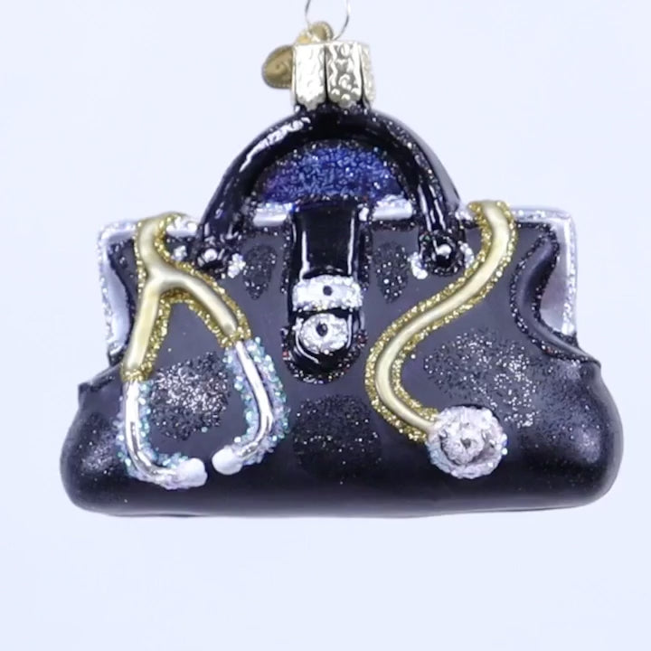 This beautiful glass Doctor's Bag ornament makes a perfect gift for a favorite doctor. It was carefully mouth-blown into a finely crafted mold. Then a hot solution of liquid silver was poured inside. Finally, the ornament was delicately hand-painted with colored lacquers and glitters for you to enjoy!