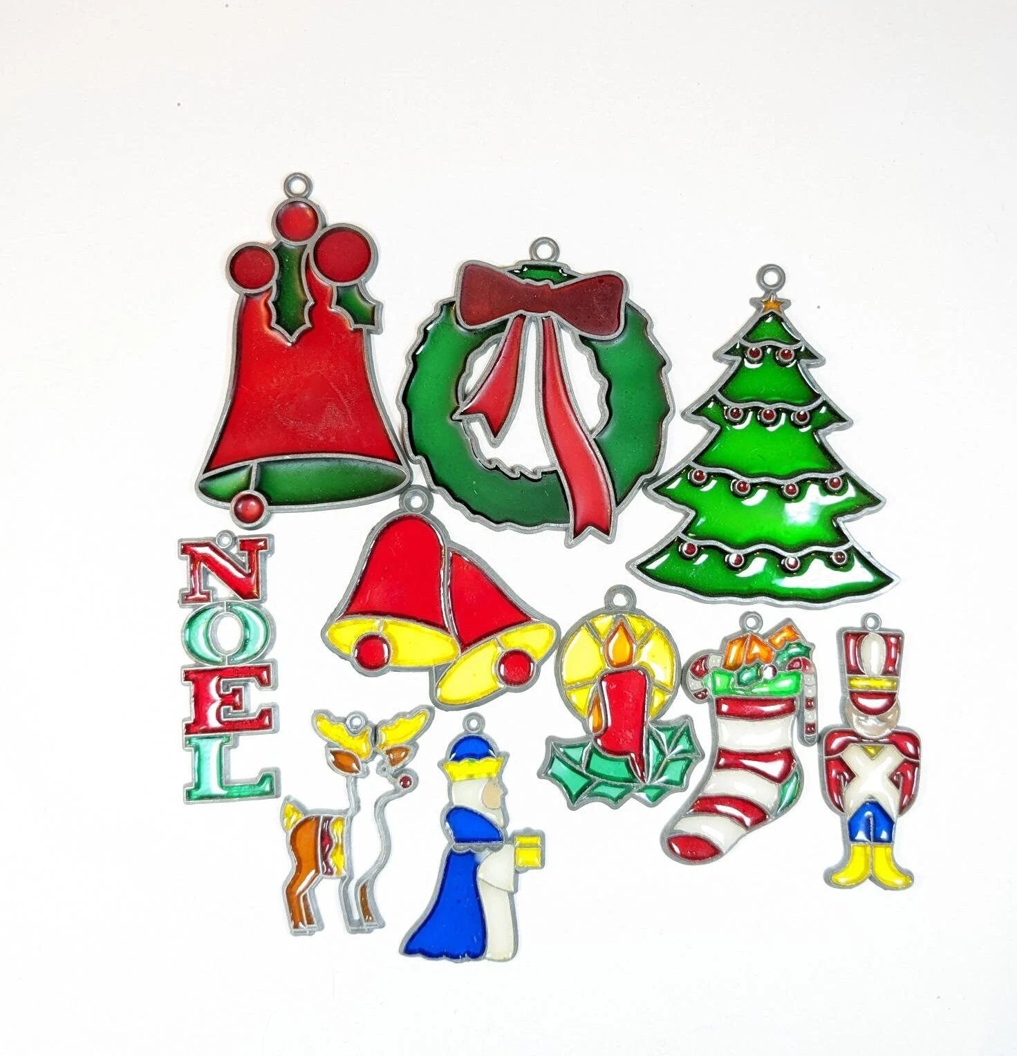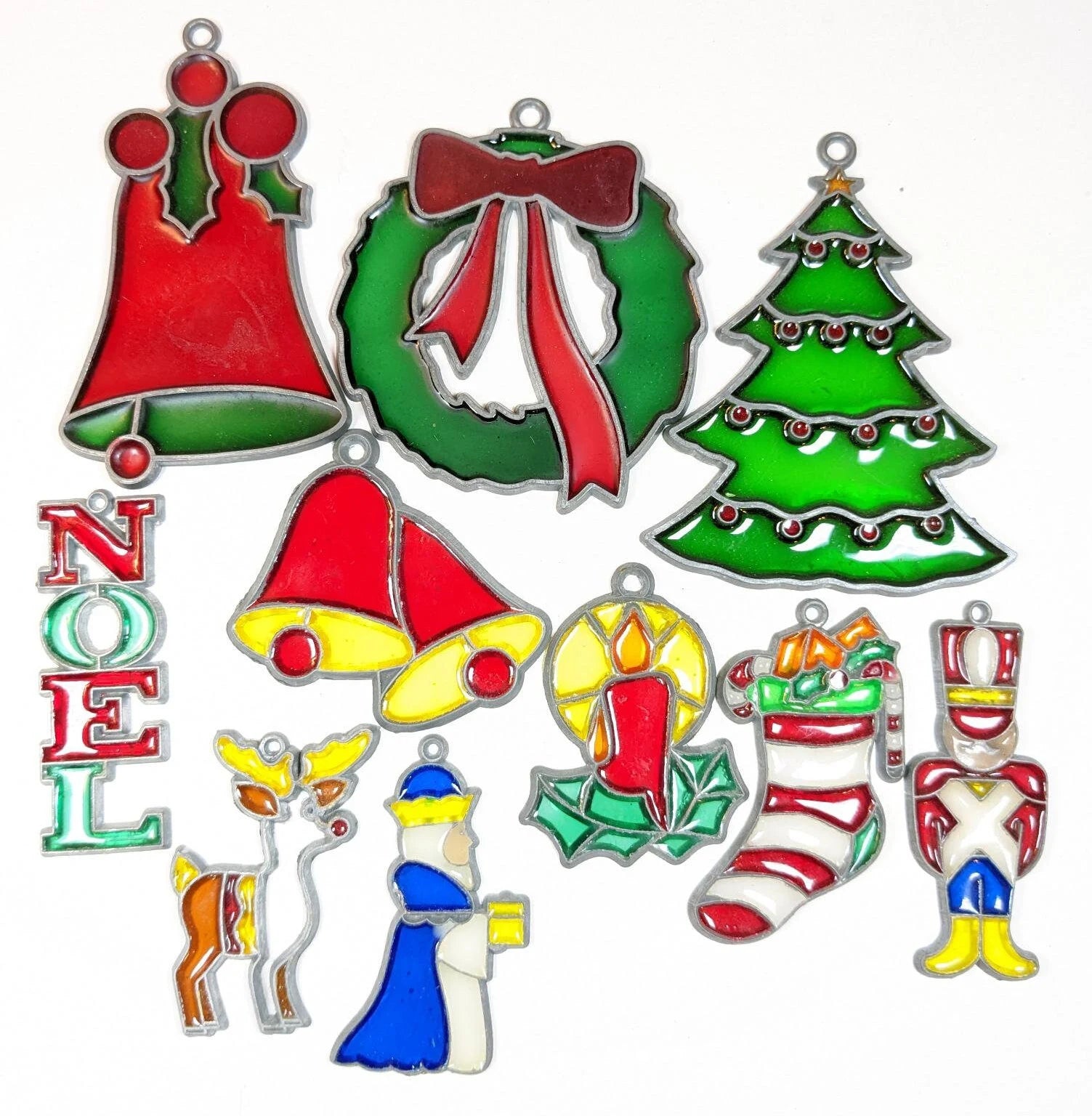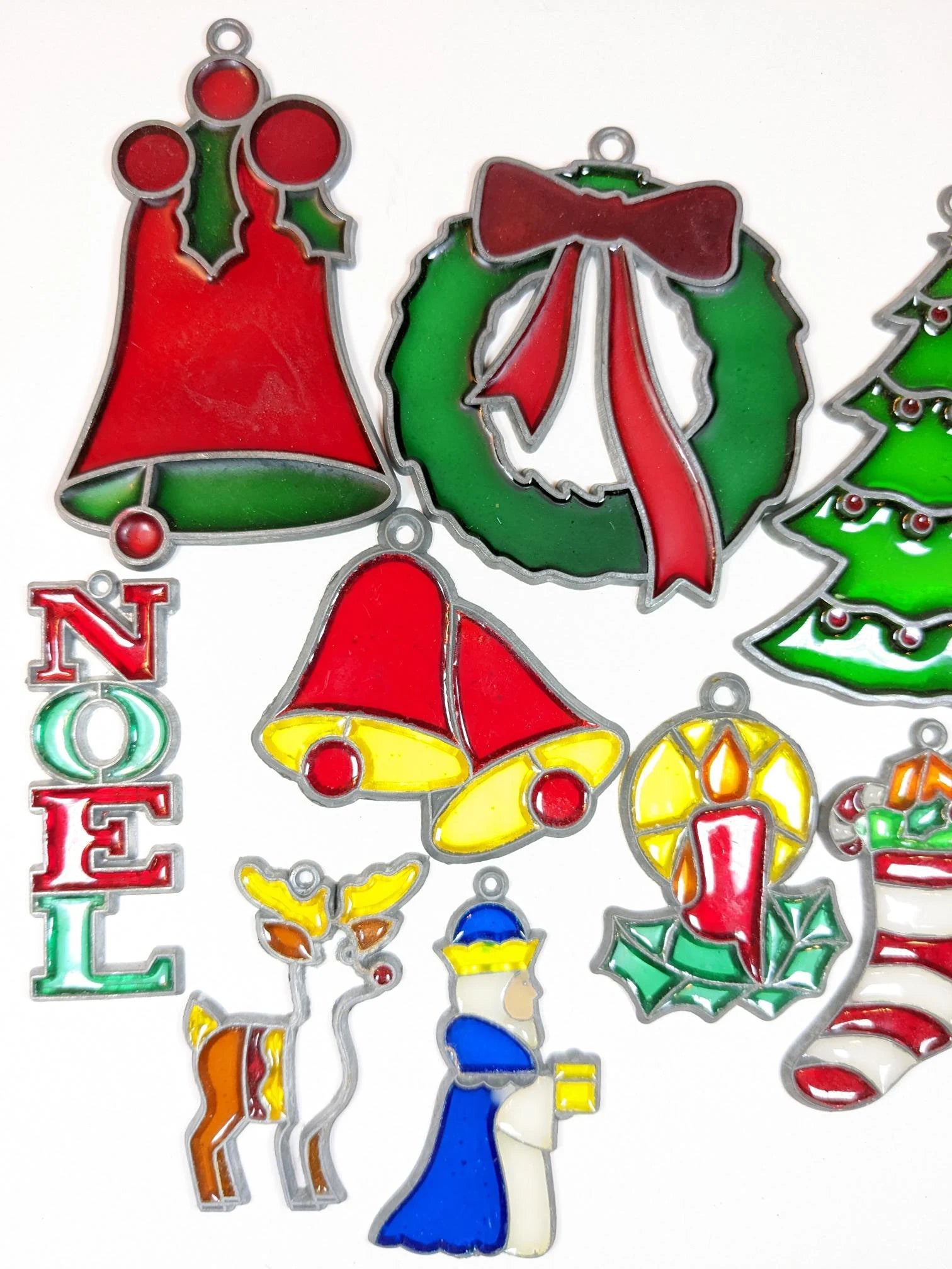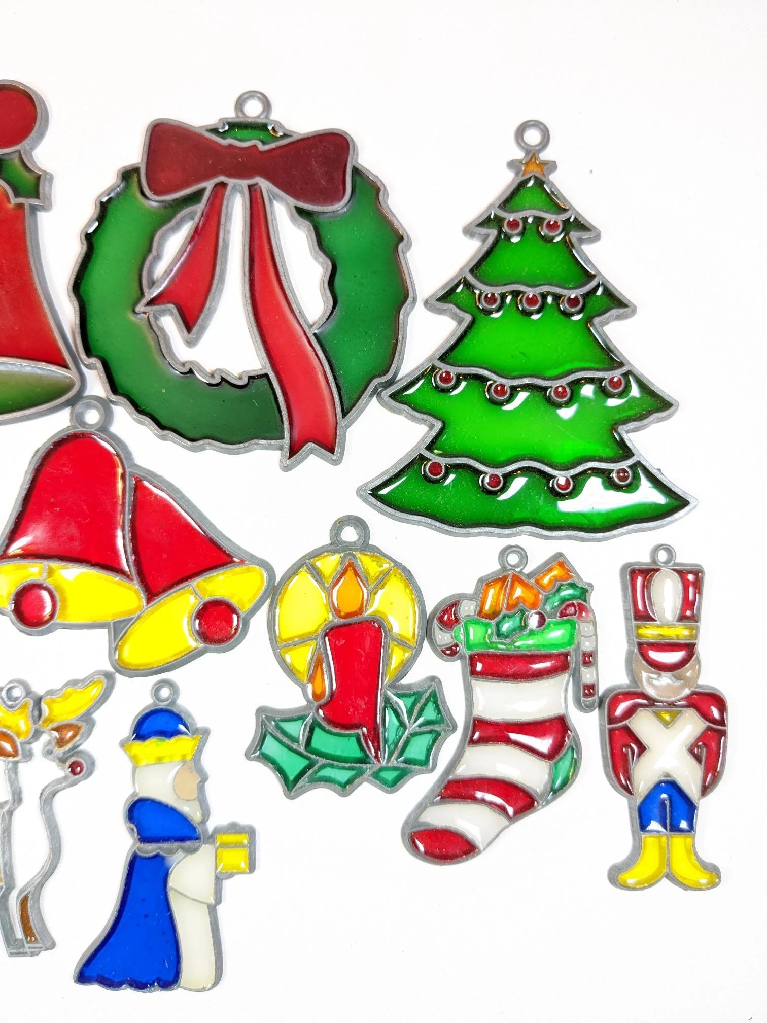 Beautiful vintage set of 10 faux stained glass Christmas Ornament. What a great find. Vintage set of glass like ornaments that catch the light beautifully. Can also be used as suncatcher for your holiday window. There are in fantastic condition with no chips or cracks. The reindeer is missing a few pieces. They range from 2 1/2" to 4". Wonderful addition to your vintage Christmas ornament collection.