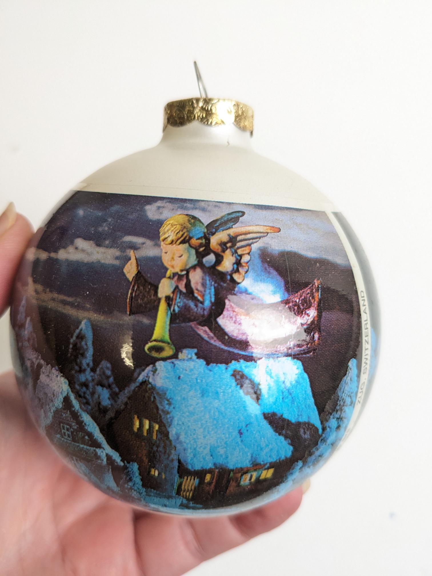 Vintage 1990 Flying Angel M.I. Hummel 1990 Glass Christmas Ornament. What a great find! 8th annual edition this gorgeous ornament features a stunning outdoor wintery scene with snow covered trees and homes with an angel flying over, so pretty.
