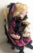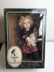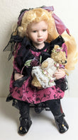 Geppeddo Felicia Porcelain Doll. This is a rare find. She is gorgeous and full of wonderful detail from her stunning brown eyes to intricate dress on her teddy bear. Just darling. She is wearing a burgundy dress with a matching bow in her hair.