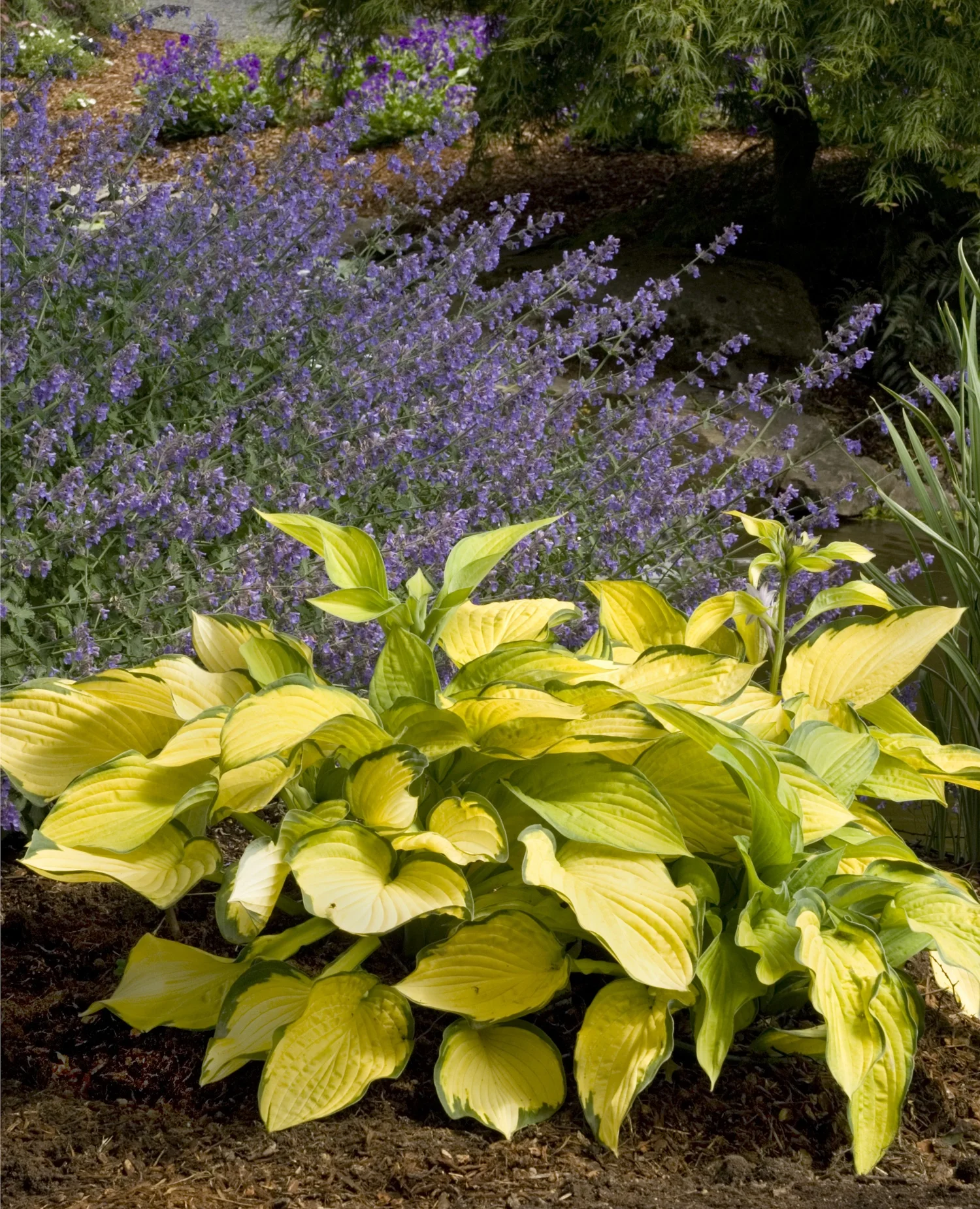 An ever-popular, classic hosta; large, ovate leaves have dark green margins. The leaf centers emerge light green in the spring and become progressively more gold towards early summer; morning sun will enhance the gold color. In midsummer pale lavender flowers appear on 30" scapes.