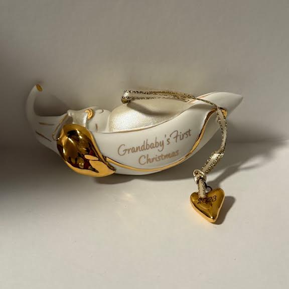 - Porcelain design features metallic gold accents and year-dated heart charm. Text reads: "Grandbaby's First Christmas. 2023"