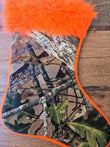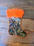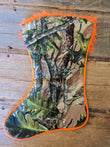 Hunting Camouflage Christmas Stocking. This is such a gorgeous stocking. It features camo of branches, leaves and trees with an orange faux fur cuff and outline, very nice! Perfect for the hunter in your life. It is in fantastic condition. Would look great on any holiday mantel waiting to be filled by Santa.