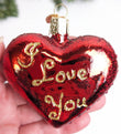 New Old World Christmas I Love You Heart Glass Christmas Ornament. What a rare find and absolutely beautiful with wonderful detail, color and sparkle. Perfect for the Love in your life. Makes a great heirloom gift. Wonderful addition to your Christmas ornament collection. Made Of Glass. Indoor Use Only.