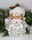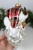This New Glass Nostalgia Plaid Santa Claus Ornament has a smiling face with gold glasses, a shiny matte white beard with sparkle, and a metallic plaid red hat for a bit of shine. This realistic design has white faux fur on the trim and a plastic and fabric holly accent with an iridescent pom pom.