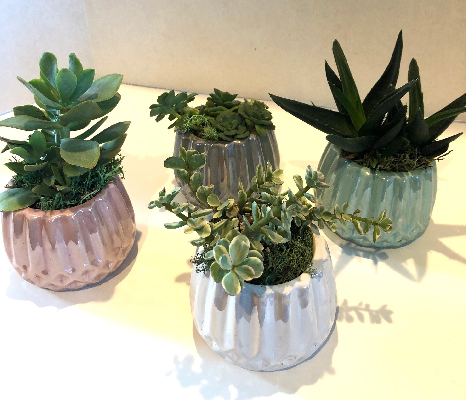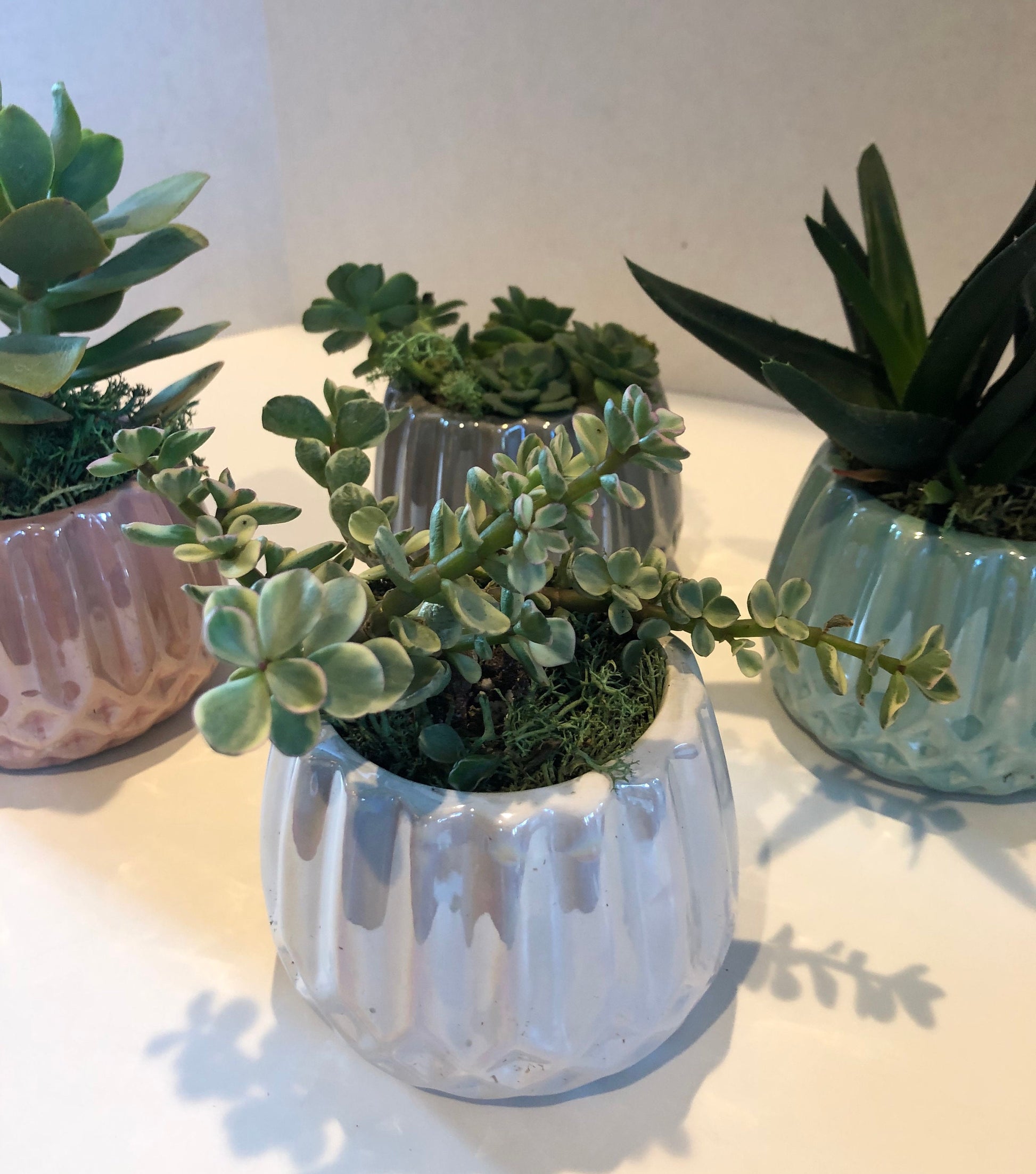 Say Aloe to my little friends Live Succulent Iridescent ceramic planters. Set of 4, each with a Beautiful Live Succulent and moss ground cover. Perfect Gift for him or her.