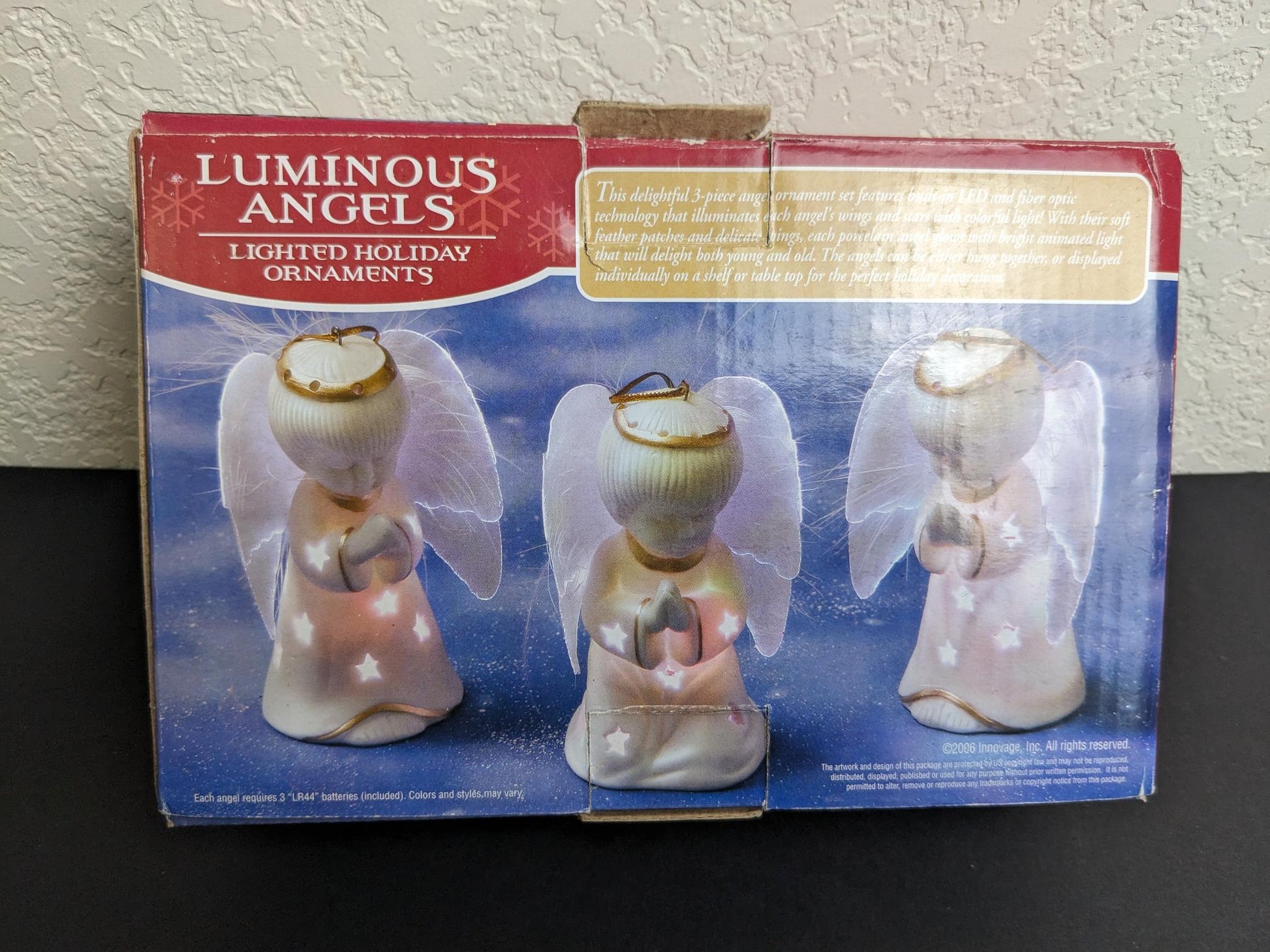 Beautiful set of 3 Luminous Angels Christmas Ornaments, made of porcelain. These are darling with beautiful detail and texture. Each one with praying hands, feather wings and star cut outs. They have an on/off switch at the bottom, once they are turned on they illuminate and change colors.