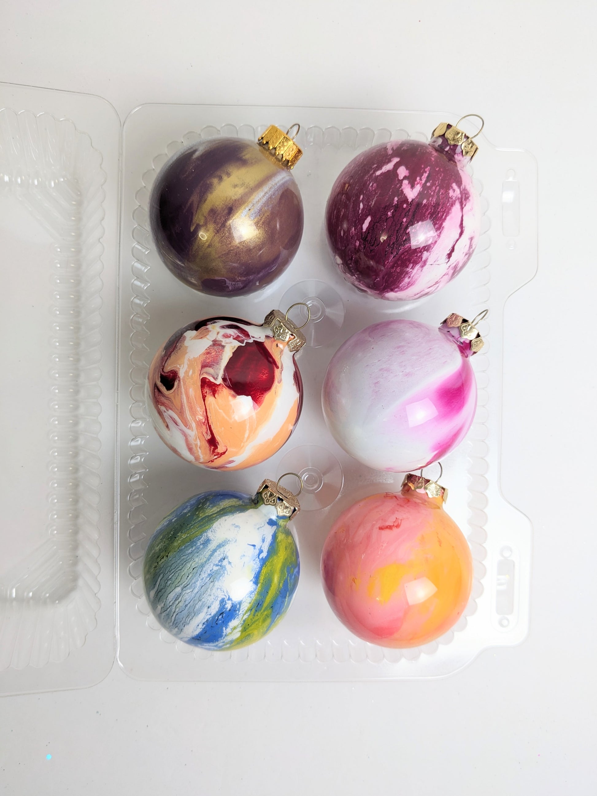 Beautiful set of 6 Marble Glass Christmas Ornaments. These are absolutely gorgeous! Beautiful variety of different shades of pink, purple blue and green. They all have different colors and patterns looking like marble or tie dye, very pretty.