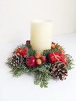 Vintage plastic candle wreath ring. This gorgeous retro candle ring features apples, pinecones, berries and presents set in pretty greenery. It is in great condition and would look absolutely beautiful on your mantel or as a centerpiece for your holiday table.