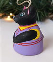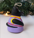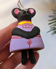 What a rare find! Black Mouse Christmas Bell Ornament. This is adorable. This mouse has a darling face with pink ears and a purple outfit. It's feet dangle from inside creating the chime for the bell, so cute!