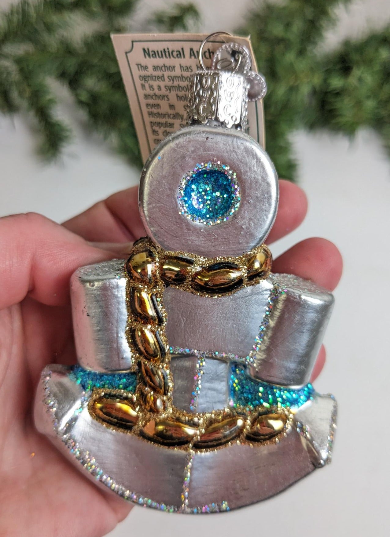 New Retired 2016 Old World Christmas Nautical Anchor Glass Christmas Ornament. What a rare find and absolutely beautiful with wonderful detail, color and sparkle. Makes a great hostess or heirloom gift. Wonderful addition to your Christmas ornament collection. This is a RETIRED old World Christmas ornament, and they are very hard to find anymore.