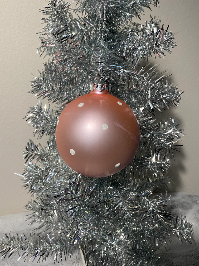 This ornament would make a great gift for a new baby girl arrival, christening, baby shower gift, or Christmas tree. This ornament is a light pink round ornament with white polka dots featuring a stork carrying a baby in a white cloth. This ornament is cute and precious and would make a perfect gift or addition to your tree.
