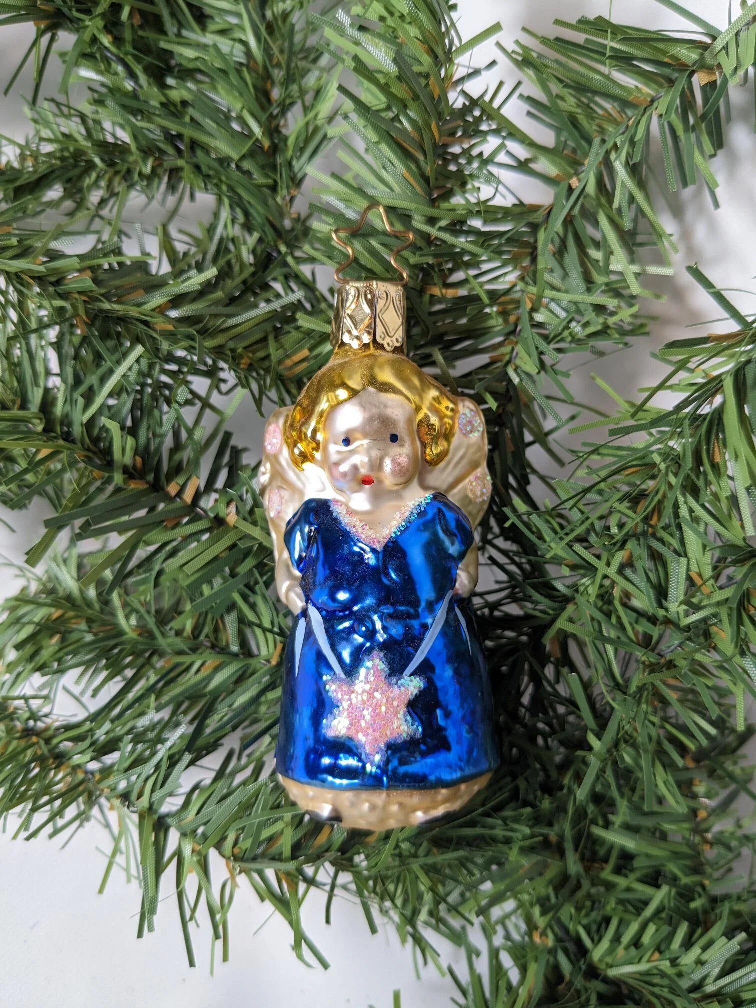 Gorgeous Blue Angel holding Star Christmas Ornament made by Inge-Glas in West Germany, part of the Bride's Tree Collection. What a rare find and absolutely beautiful with wonderful color and detail. Perfect gift for the Angel in your life. Great addition to your vintage Christmas ornament collection. This is a RETIRED old World Christmas ornament, and they are very hard to find anymore. Measuring 3 1/4" tall.