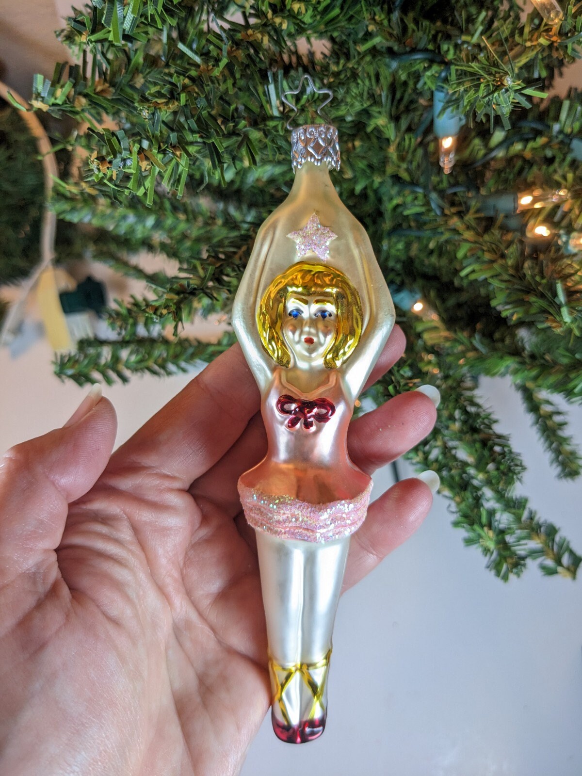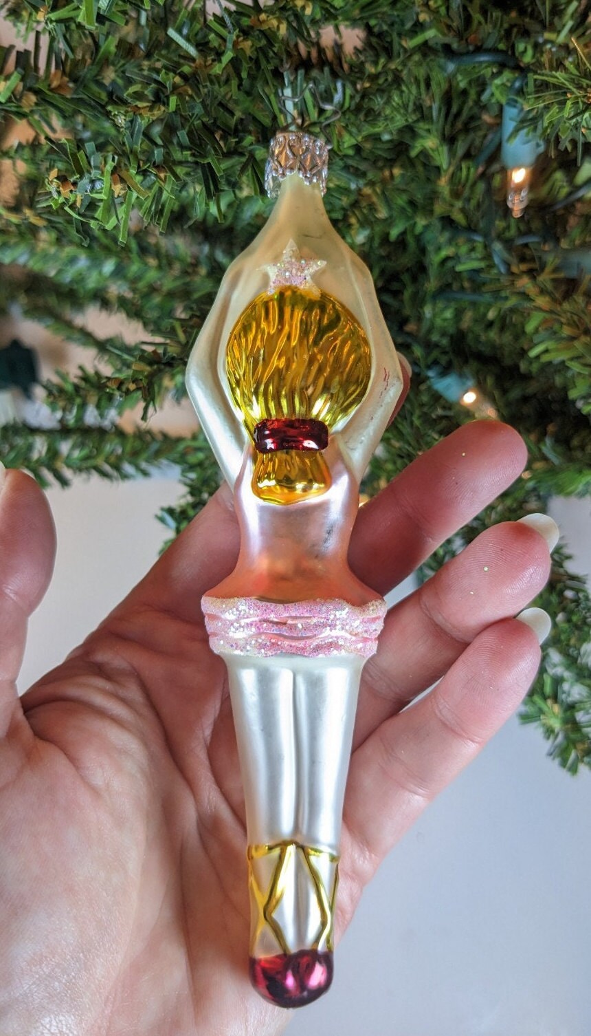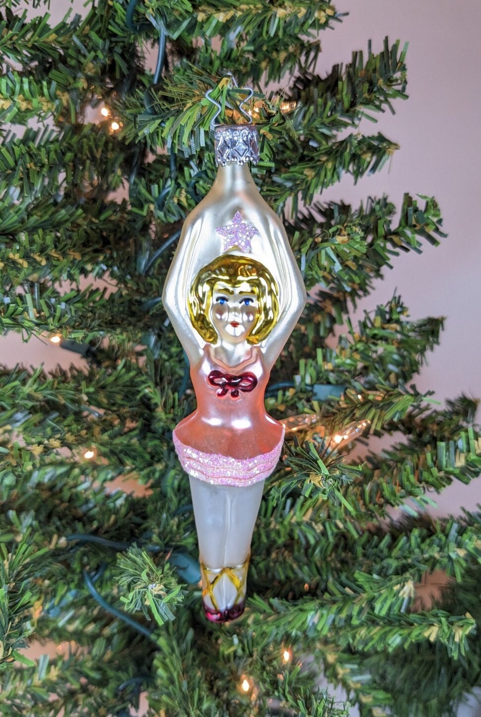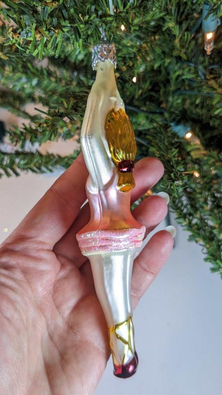 Gorgeous Ballerina Christmas Ornament made by Inge-Glas in West Germany. What a rare find and absolutely beautiful with wonderful detail, color and sparkle. Perfect gift for the ballerina in your life. Makes a great heirloom gift or first ornament for a little one. Can be used year-round. Great addition to your vintage Christmas ornament collection. This is a RETIRED old World Christmas ornament, and they are very hard to find anymore.