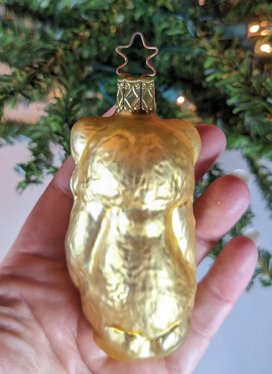 Gorgeous Golden Bear Christmas Ornament made by Inge-Glas in West Germany. What a rare find and absolutely beautiful with wonderful detail, color and sparkle. Perfect gift for the Bear collector in your life. Makes a great hostess gift or first ornament for a little one. Wonderful addition to your vintage Christmas ornament collection. This is a RETIRED old World Christmas ornament, and they are very hard to find anymore.