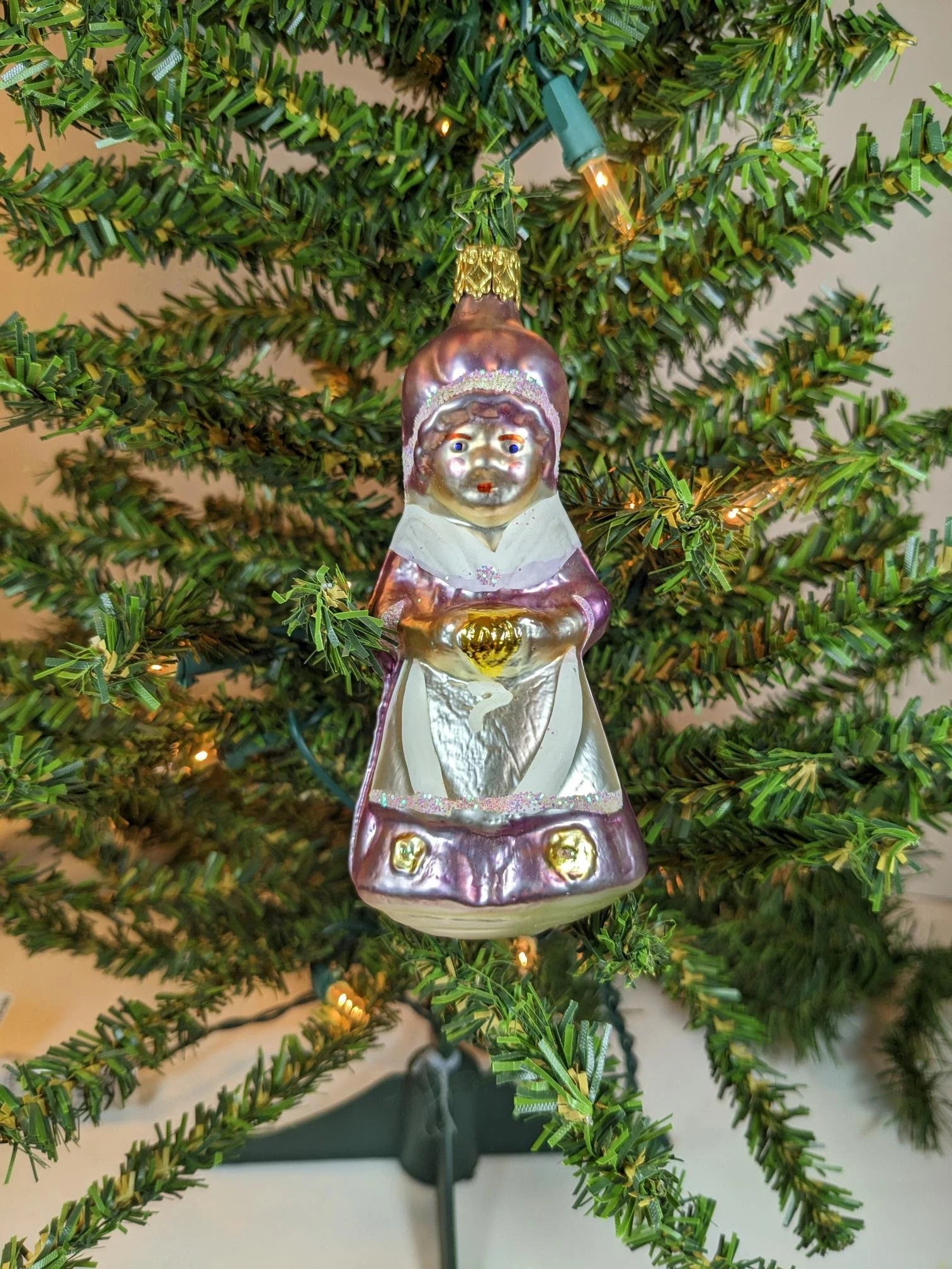 Gorgeous Grandma Christmas Ornament made by Inge-Glas in West Germany. What a rare find and absolutely beautiful with wonderful detail, color and sparkle. Makes a great heirloom gift and can be used year-round. Great addition to your vintage Christmas ornament collection. This is a RETIRED old World Christmas ornament, and they are very hard to find anymore.