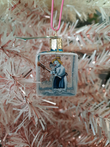 Hand painted glass ornament depicts two snowmen. One waving and another with a straw hat and broom. The ornament is blown in the shape of a square gift. Ornament is clear with paint on the interior.