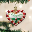 Old World Christmas Ornament, Adorable "Our First Christmas" peppermint heart ornament with holly on the front and back.