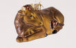 The Ox, as one of the "friendly beasts," shared the stable with the Baby Jesus. He did not eat in order to share his hay as a cushion in the manger. He warmed the Baby with his breath, and at midnight on Christmas Eve, and every Christmas thereafter, the Ox kneels down to honor the Lord.