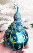 New Gorgeous Peacock Christmas Ornament. What a rare find and absolutely beautiful with wonderful detail, color and sparkle. Makes a great hostess or heirloom gift. The top is made of resin and the ball is made of glass, just stunning. Wonderful addition to your Christmas ornament collection. Indoor Use Only. Measuring 5 1/2" tall.