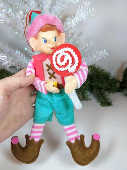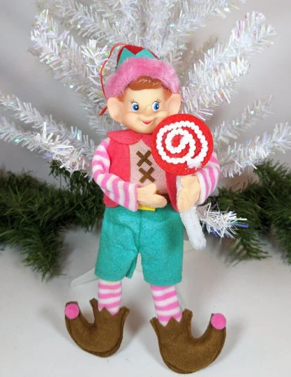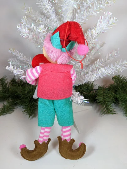 Pink Elf with Candy Christmas Ornament. What a fun find! Elf dressed in pink and teal holding a lollipop ready to dress up your Christmas tree. Lots of fun to be had with this great ornament.