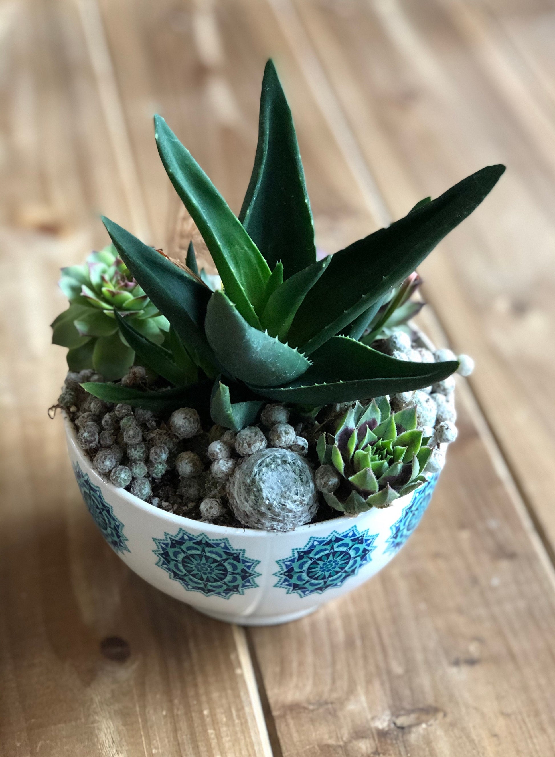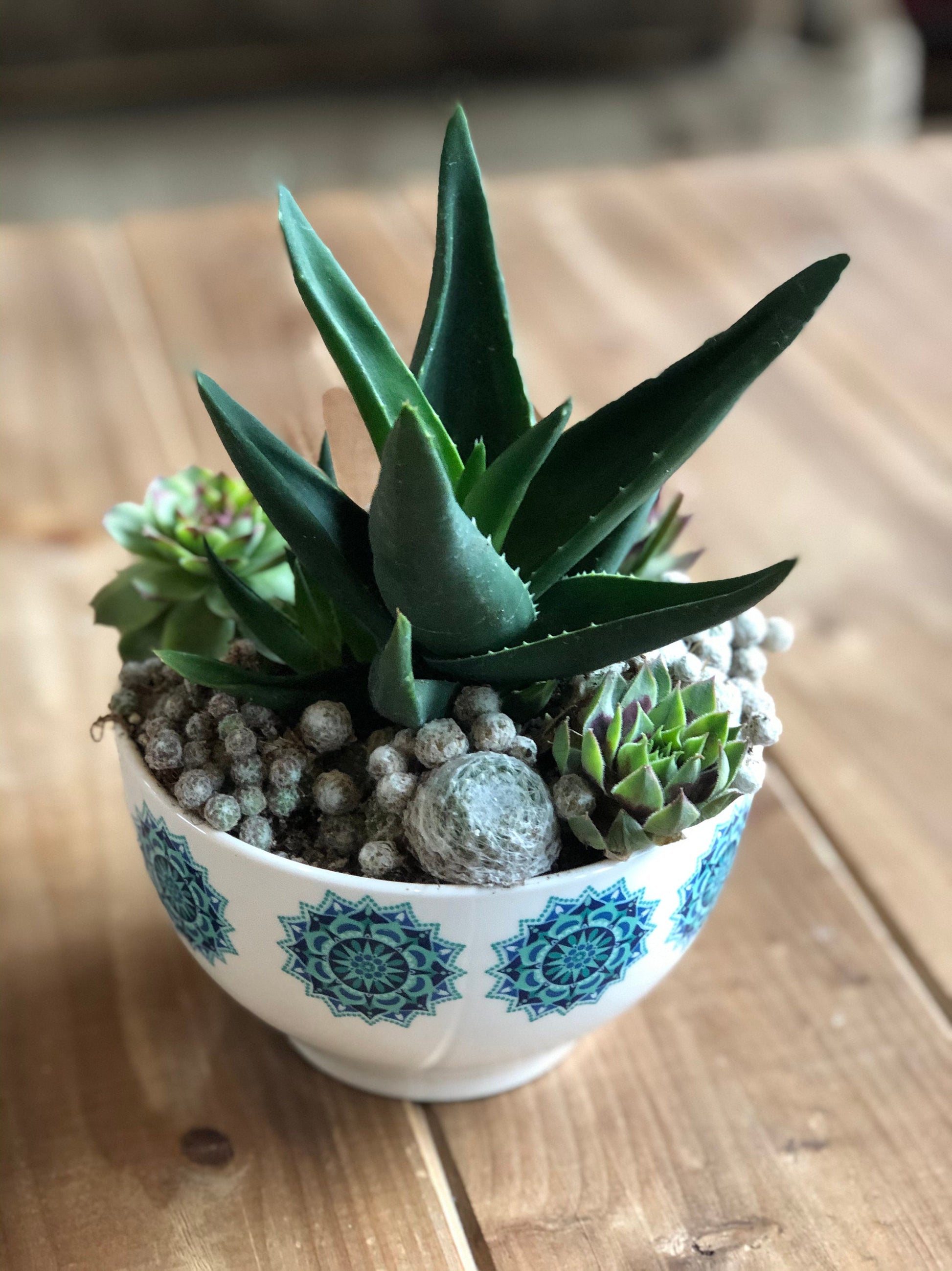 Premium Succulent Arrangement in MCM Retro Boho White and Turquoise Ceramic Container