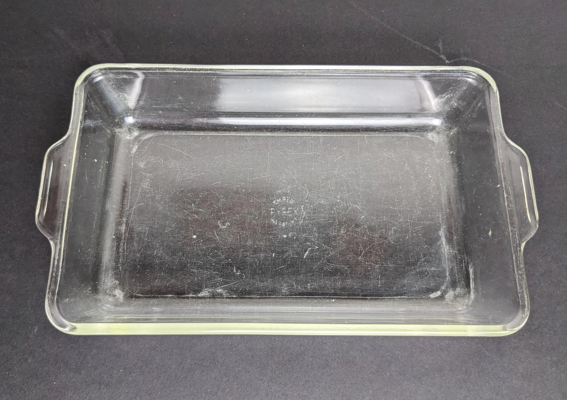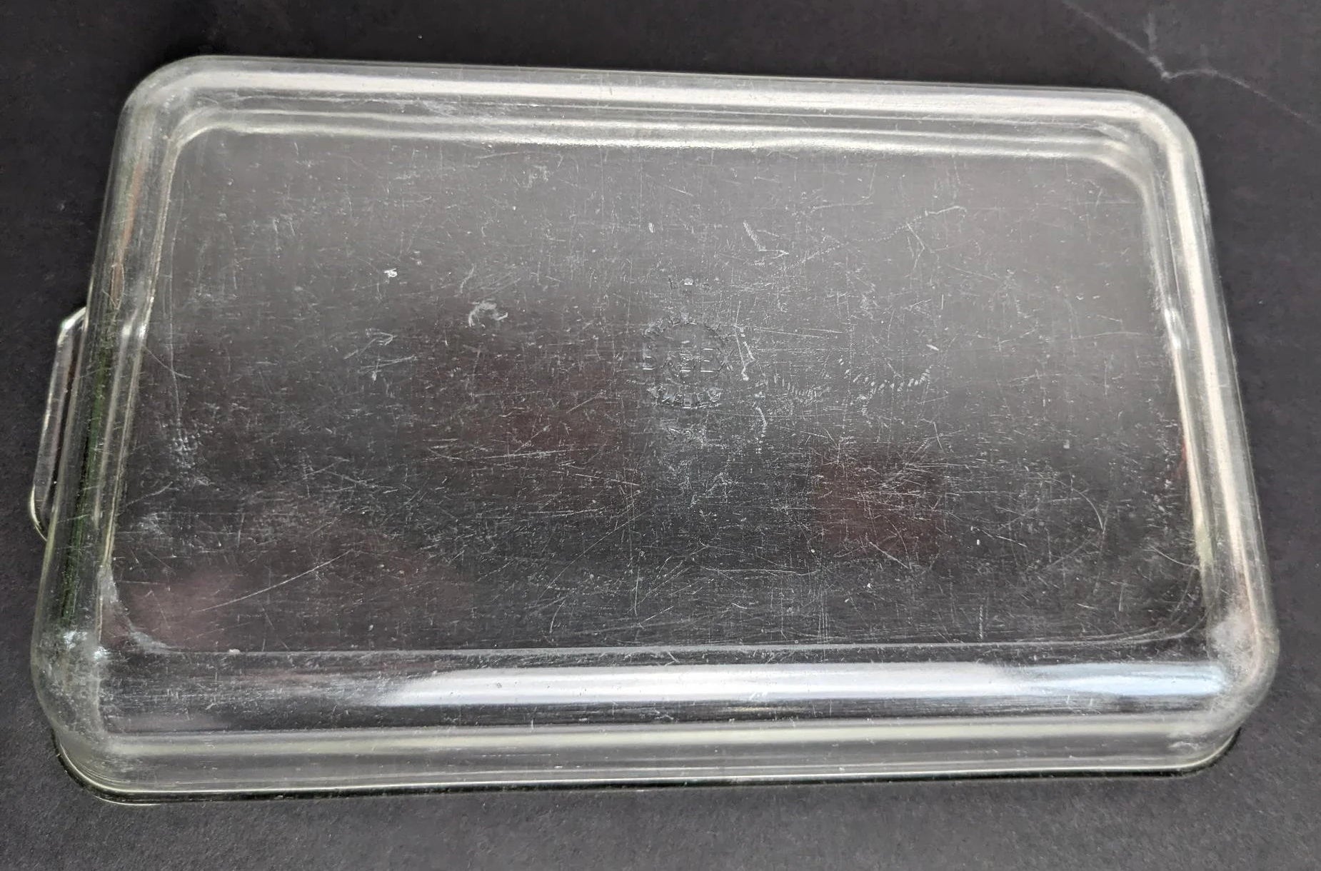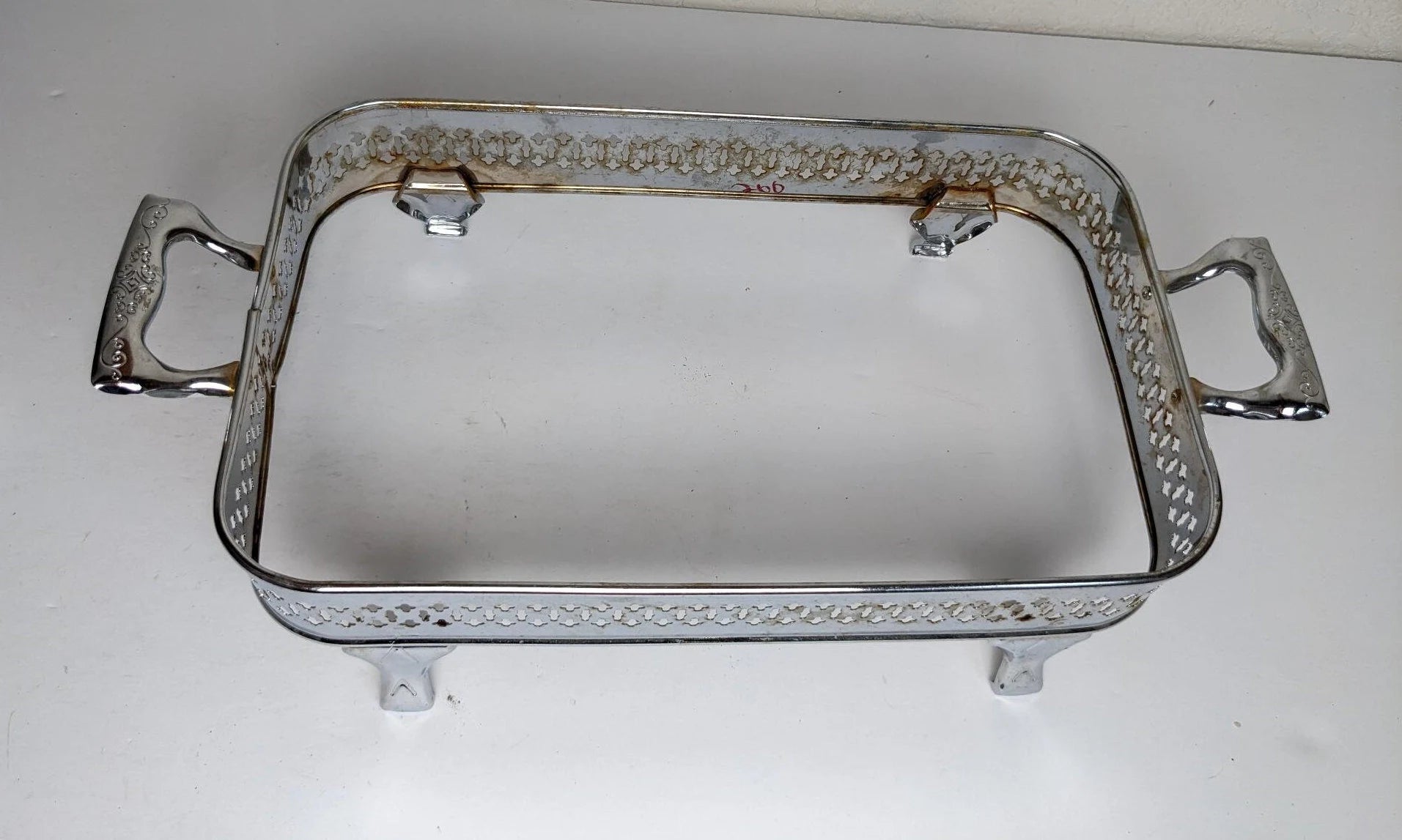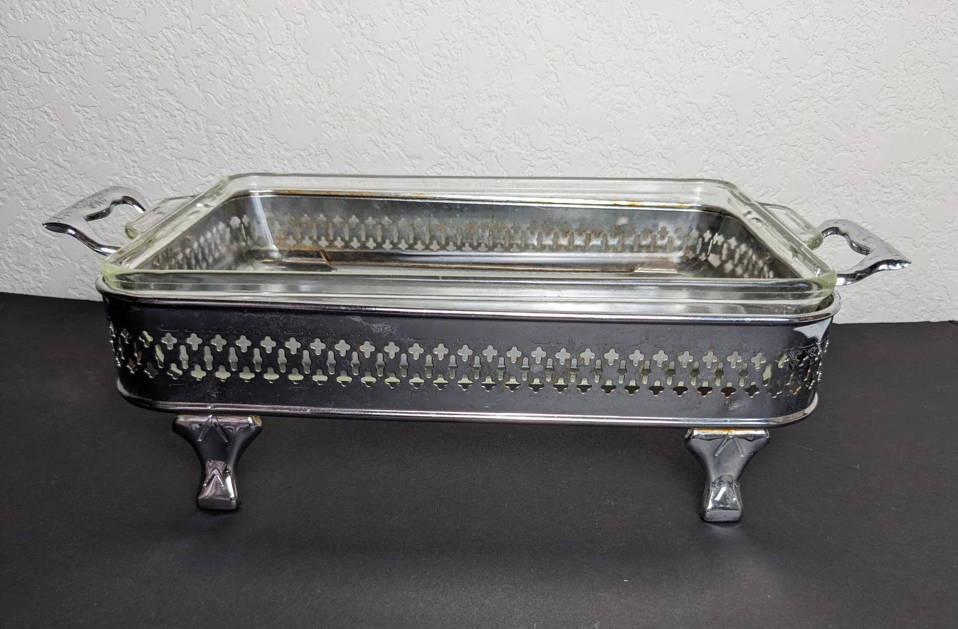 Vintage Pyrex Clear Glass Casserole Dish with Silver Toned Serving Tray.
