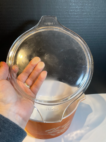 Pyrex Cinderella Autumn Harvest Wheat Nesting Bowls Set of 2 Pyrex Casserole Dishes 474 B and 473 D and Pyrex lid 474-C.